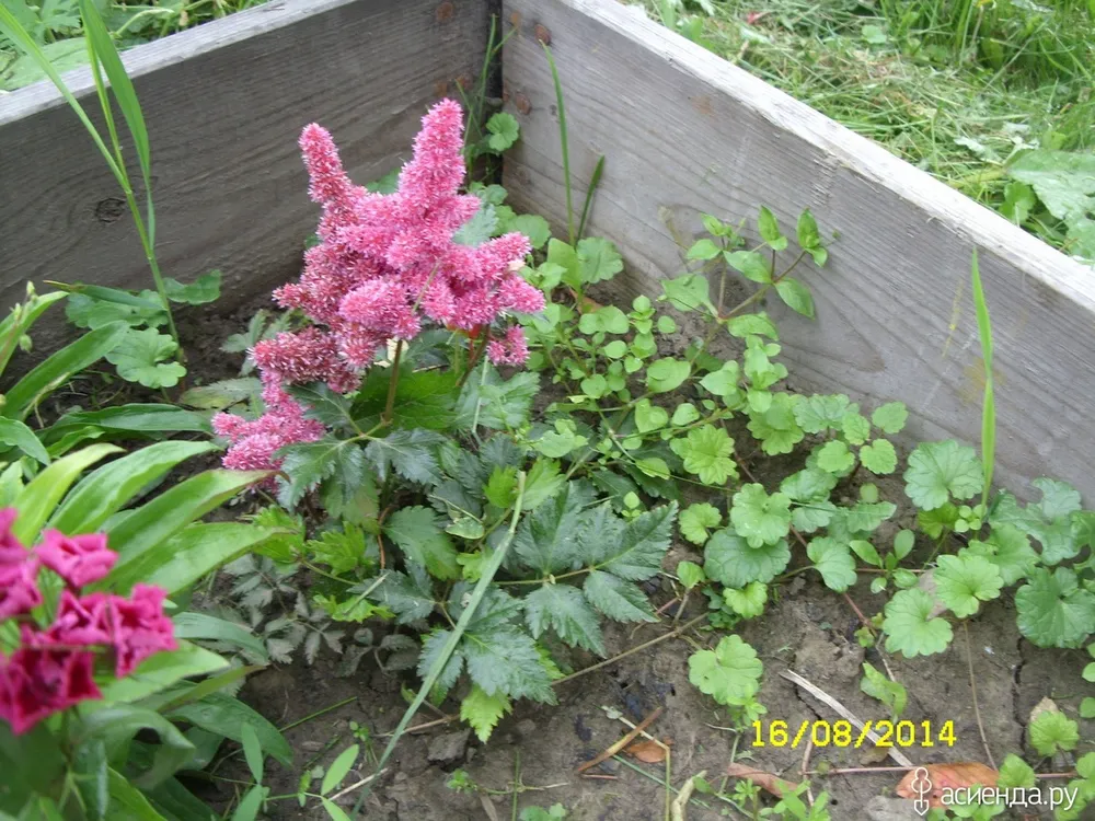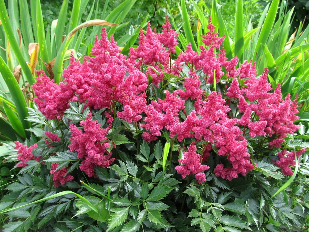 Астильба японская ‘Кельн’ отличается от других сортов более компактным размером и насыщенно-розовым окрасом соцветий.