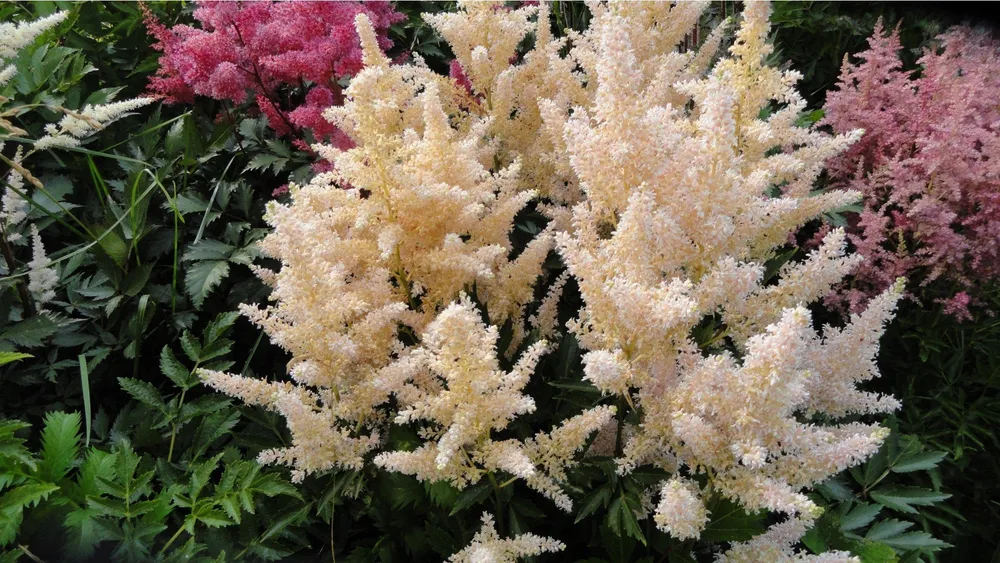 Сорт ‘Bridalveil’ имеет белесый цвет, а сорт ‘Deutschland’ — красный. Астильба ‘Vision’ имеет высоту до 90 см.