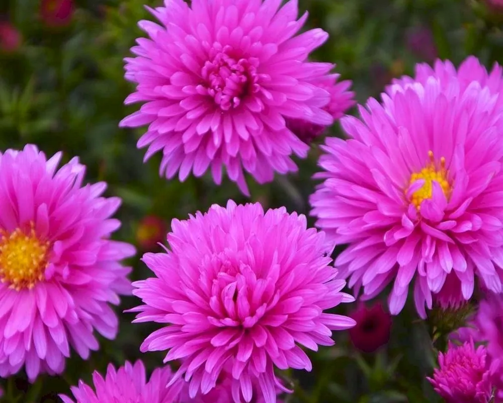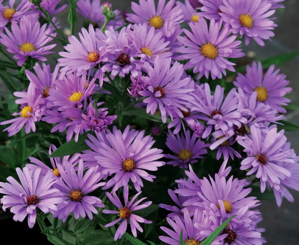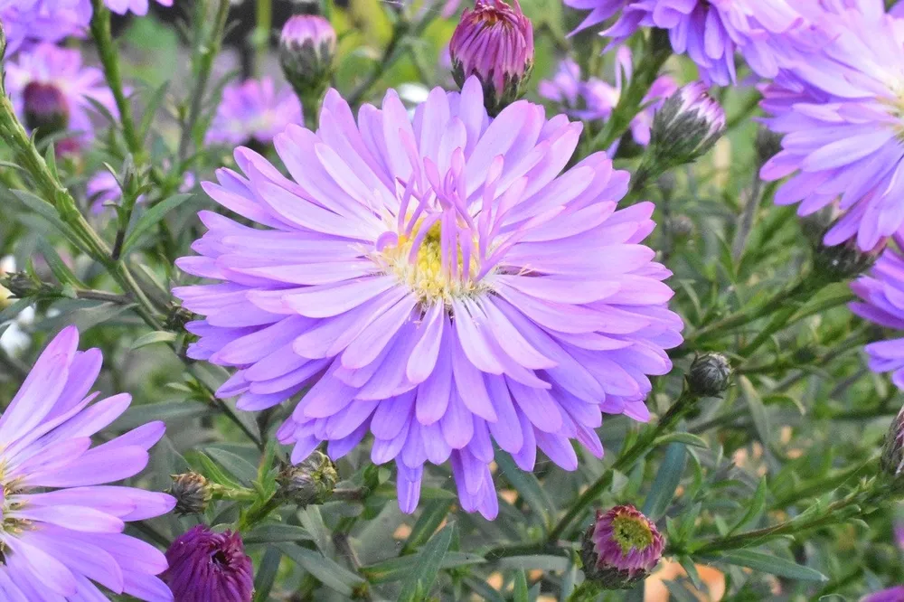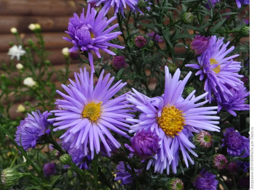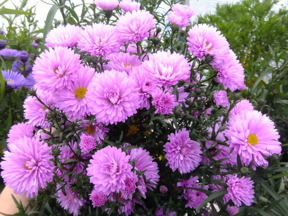 Астра «Патрисия Баллард» выделяется среди других сортов астр своей насыщенной пурпурной окраской, бархатистым налетом на лепестках и пышным цветением.