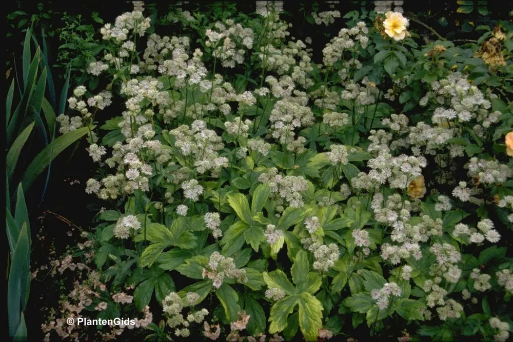 Астранция Вариегатад Вайт выделяется среди других сортов своим бело-зеленым окрасом листьев.