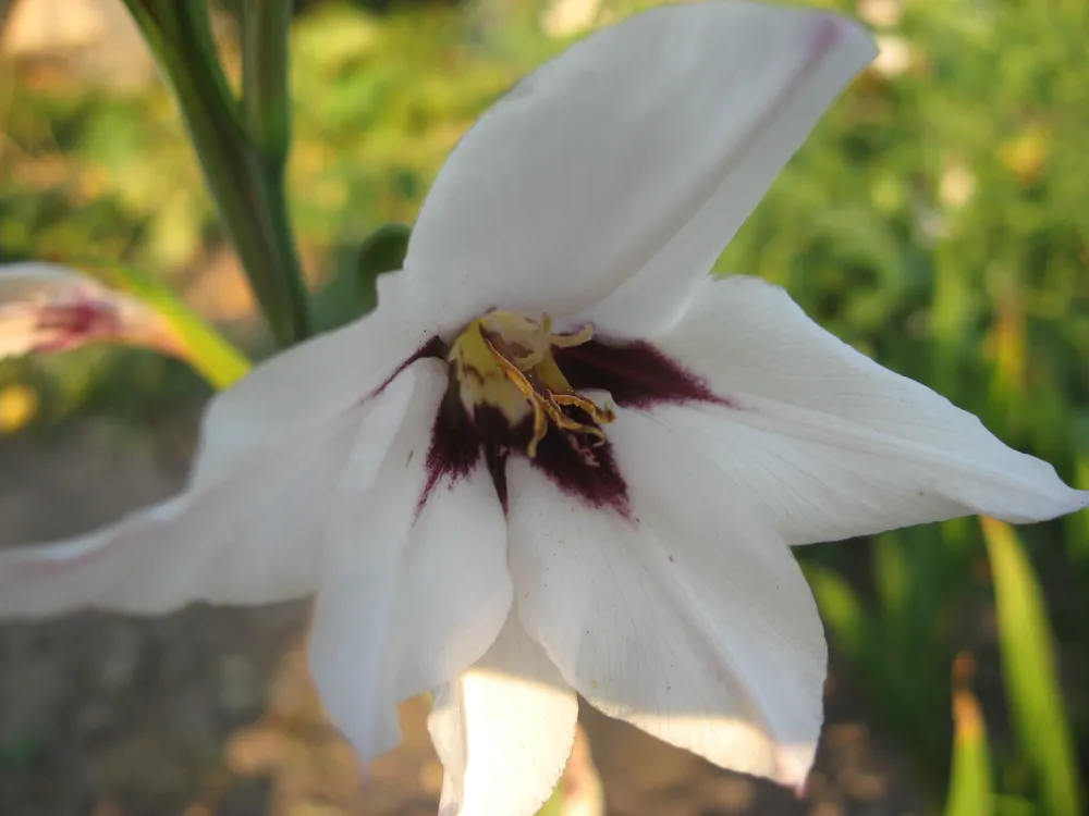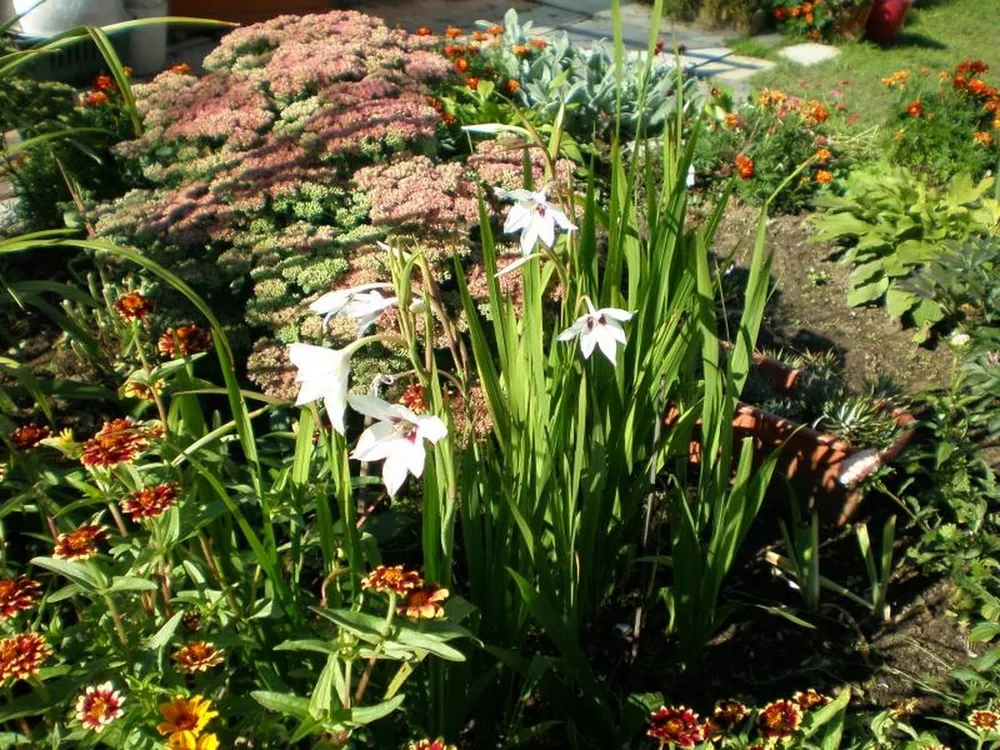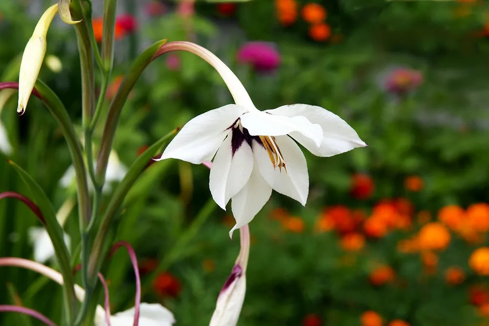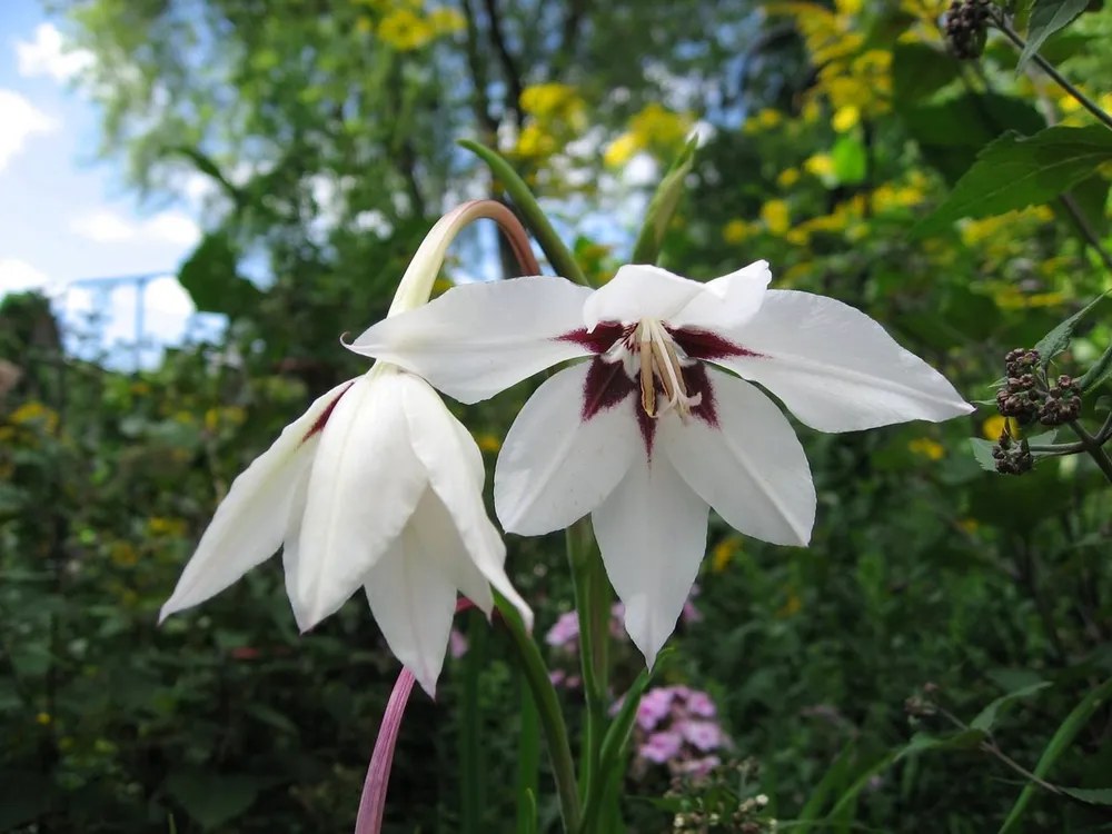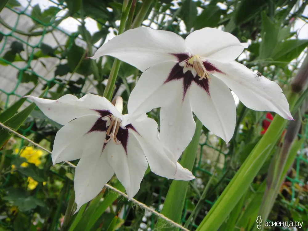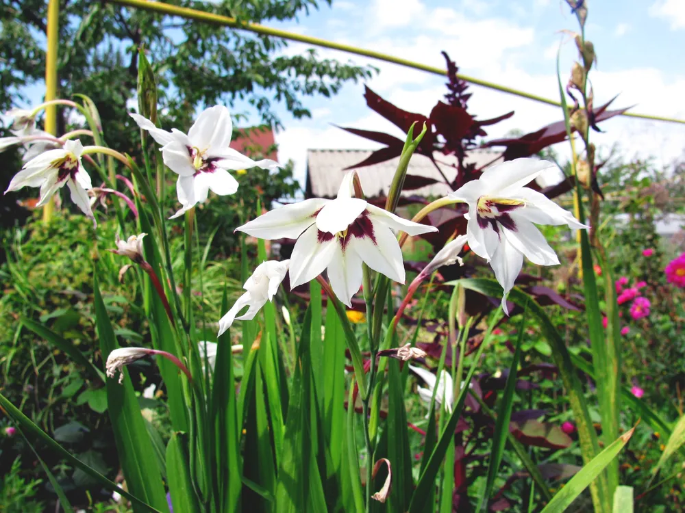 **Сравнение с другими сортами** Ацидантера отличается от других сортов гладиолусов более компактным размером куста и меньшей высотой стеблей. Она также выделяется своими необычными, воронкообразными цветками, которые могут быть разных оттенков. В отличие от некоторых видов гладиолусов, ацидантера обладает сильным ароматом, привлекающим пчел и других насекомых-опылителей.
