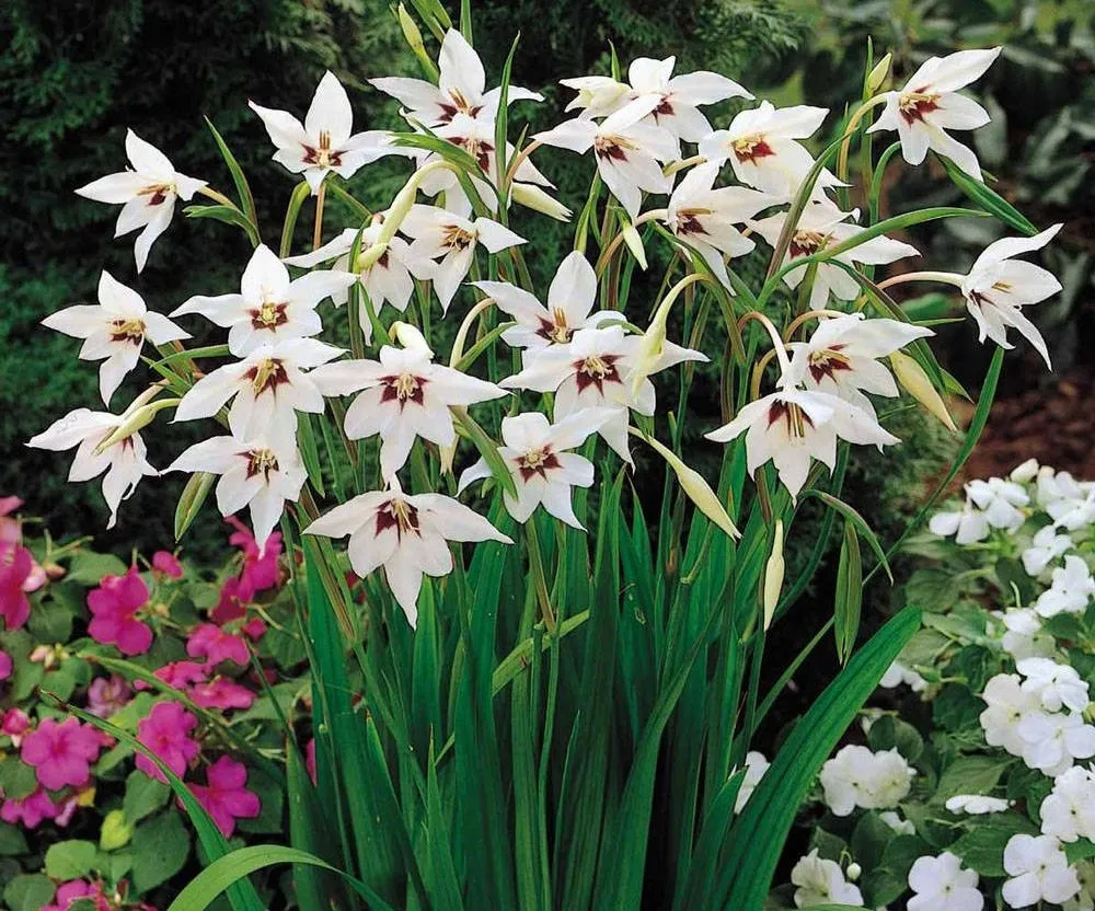 Ацидантера, также известная как душистый гладиолус, – это эффектное растение из семейства Ирисовых, которое своим необычным видом и ароматом украсит ваш сад. Выделяют ее крупные цветки, напоминающие похожие на воронковые формы гладиолусов, но с более плотными лепестками. Цветение душистого гладиолуса длится довольно продолжительно – с лета до осени, радуя глаз своим разнообразием оттенков: от нежно-розовых и кремовых до глубокого синего и фиолетового. Родина ацидантеры – тропические регионы Африки. Свое название растение получило благодаря своему отличительному аромату, который напоминает сладкий мед. Ацидантера предпочитает теплый климат с достаточным количеством солнечного света, что обуславливает ее популярность в выращивании как однолетней культуры в регионах с холодными зимами.