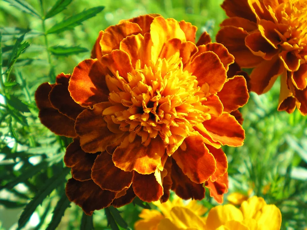 Тигровые глаза выделяются среди других сортов бархатцев своей необычной окраской лепестков. В то время как многие сорта имеют однотонный цвет, Тигровые глаза сочетают в себе желтый, оранжевый и красный цвета, создавая эффектный контрастный рисунок.