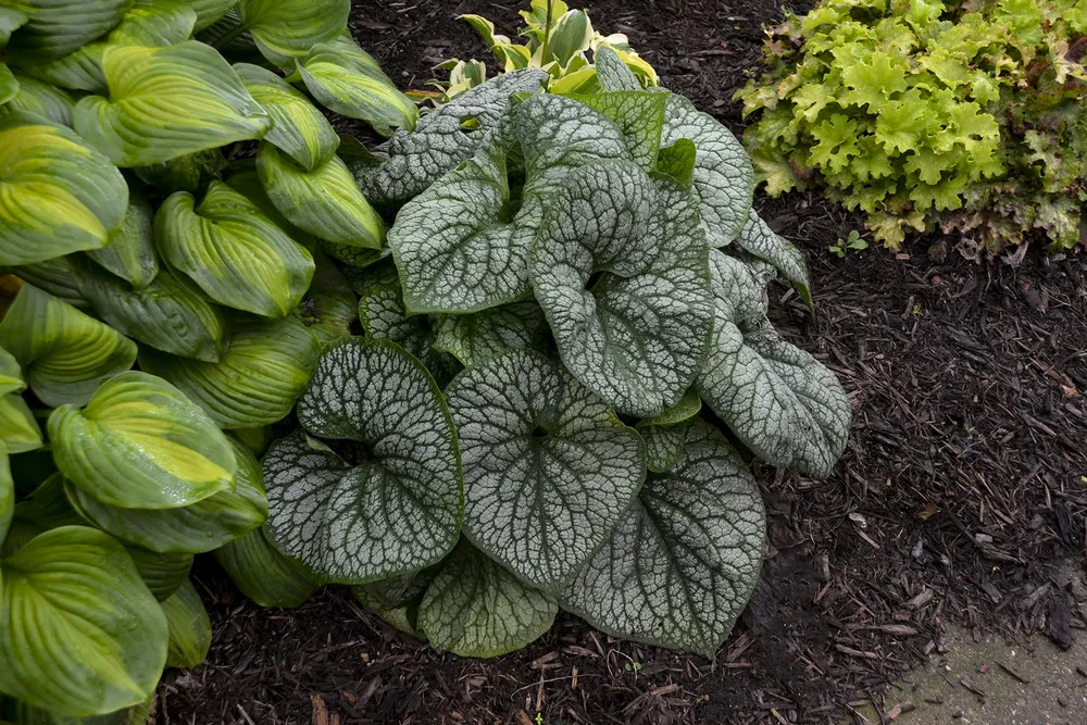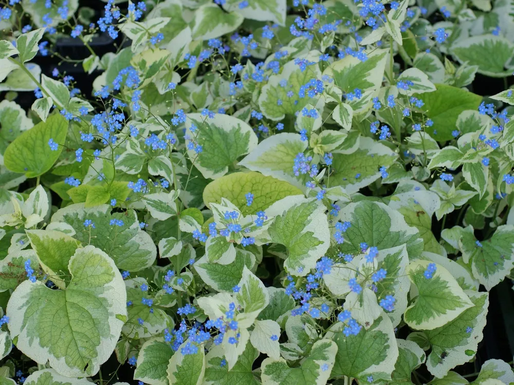 Бруннера макрофила — один из самых популярных сортов бруннеры. Ее отличают крупные листья с яркими крапинками и обильное цветение. Другие сорта бруннеры, например, бруннера ‘Silver Falls’, отличаются более мелким размером листьев и плакучей формой кроны.