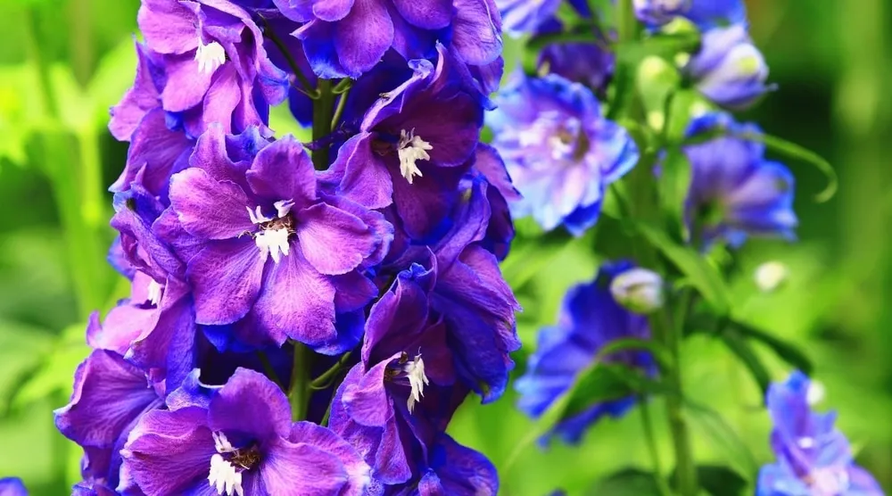 - Цветы дельфиниума ‘Блю Май’ синие, а Дельфиниума Пур Вайт — розовые.