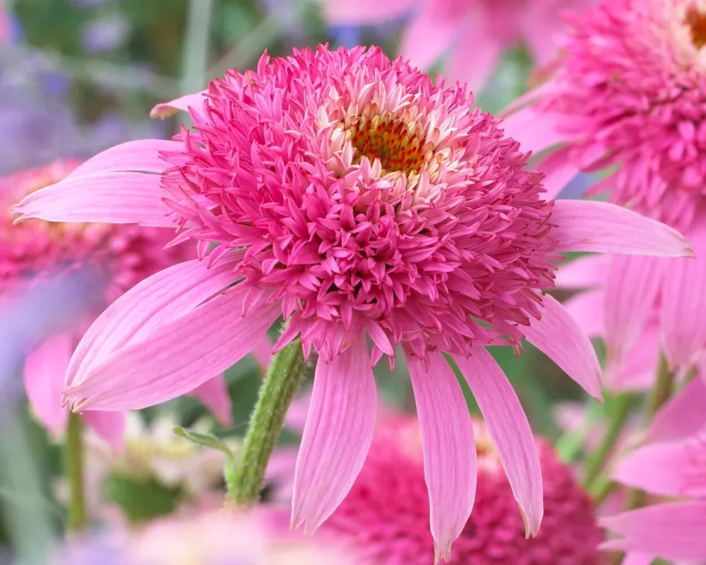 Эта эхинацея – настоящее украшение сада, способное стать центром композиции или гармонично вписаться в ландшафтную планировку. Ее крупные шарообразные соцветия с волнистыми лепестками представлены в нежном розовом цвете, переходящем в желтый по краям. Цветение продолжается с июля до первых заморозков, радуя глаз яркими акцентами на протяжении всего лета и ранней осени.