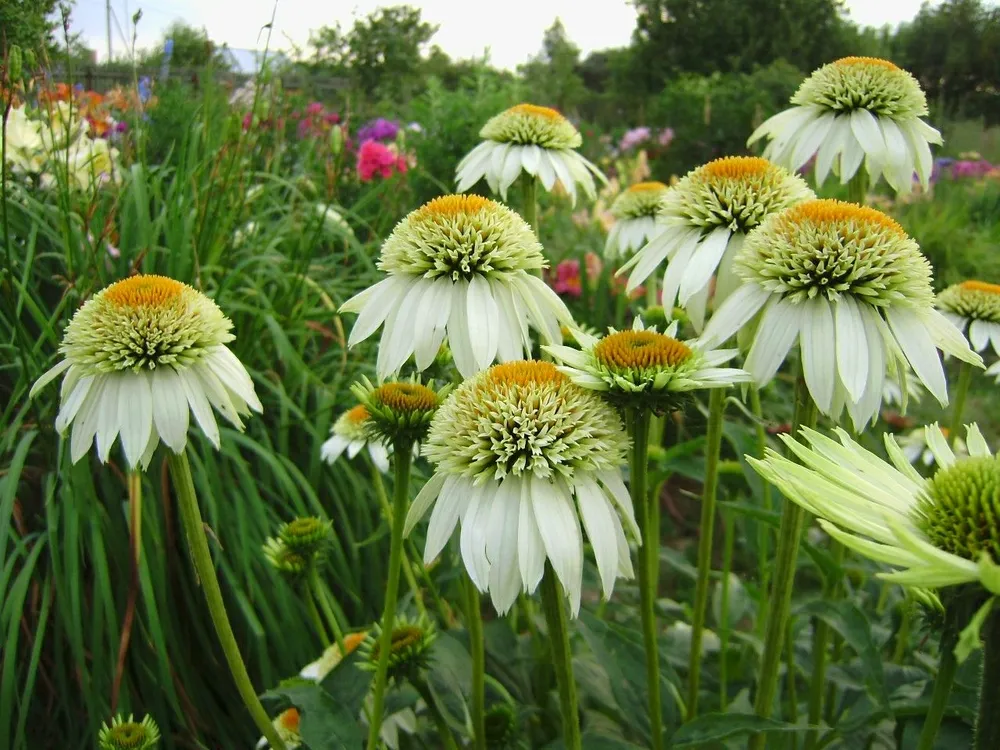 Эхинацея представлена в огромном разнообразии сортов, отличающихся по цвету, форме соцветий, высоте и срокам цветения. Некоторые популярные сорта: * **Echinacea purpurea ‘Magnus’**: Этот сорт отличается крупными пурпурно-розовыми цветами с желтым центром. Высота растения достигает 80-100 см. * **Echinacea purpurea ‘White Swan’**: Сорт с белыми, махровыми цветами и высотой 70-90 см. * **Echinacea pallida ‘Tomato Candy’**: Имеет яркие оранжевые цветки, напоминающие помидоры. Высота растения – 60-80 см. Каждый сорт имеет свои особенности и преимущества, поэтому выбор зависит от личных предпочтений цветовода и условий выращивания.