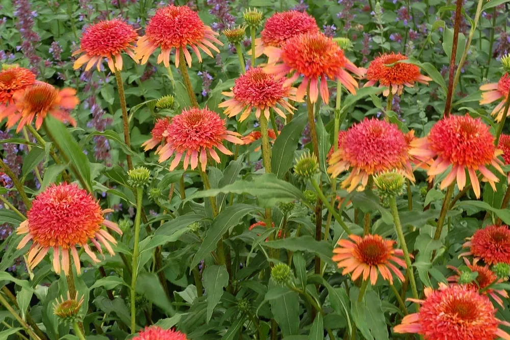 Эхинацея пурпурная ‘Блейз Оранж Сансет’ — это восхитительный сорт, который покорил сердца цветоводов своим необычным окрасом и неприхотливым характером. Он относится к группе поздноцветущих эхинацей, что позволяет наслаждаться его яркими цветами с конца лета до первых заморозков. Этот сорт представляет собой настоящую находку для тех, кто любит экспериментировать с цветом в своем саду. Его махровые соцветия окрашены в насыщенный оранжевый оттенок с пурпурными контурами, создавая невероятный контраст и добавляя яркости любой цветовой композиции.