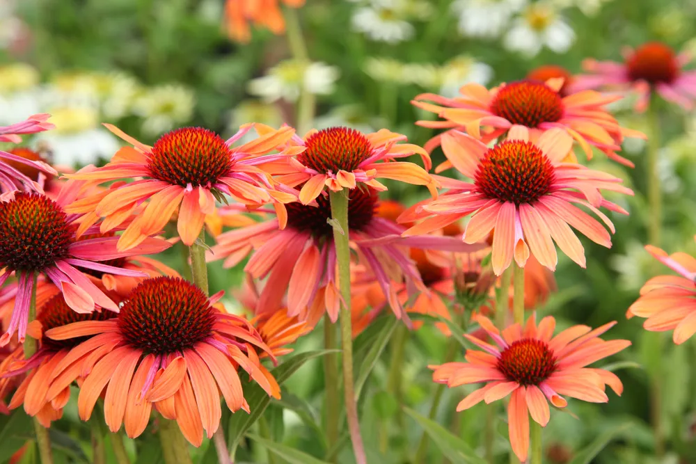 Эхинацея ‘Блейз Оранж Сансет’ выделяется на фоне других сортов эхинацей своим необычным окрасом. *