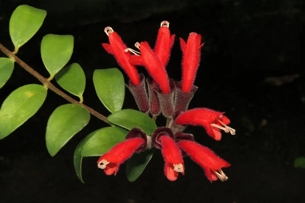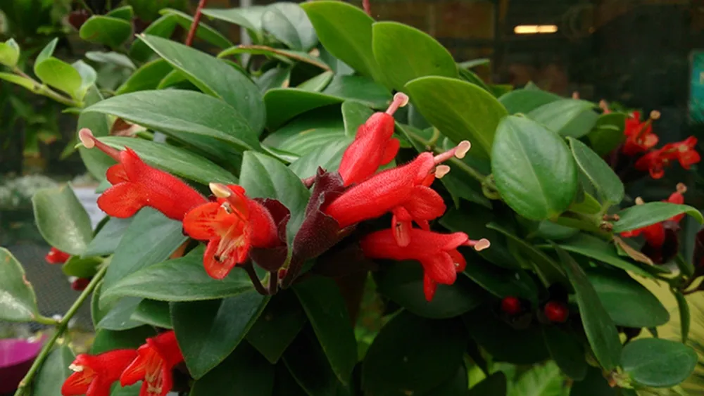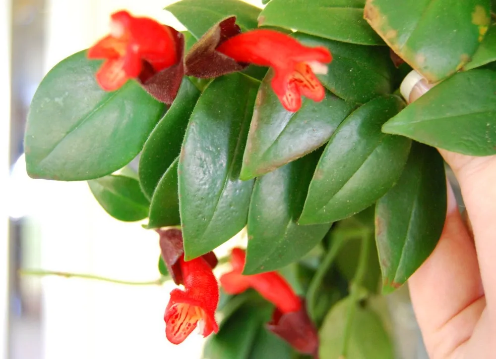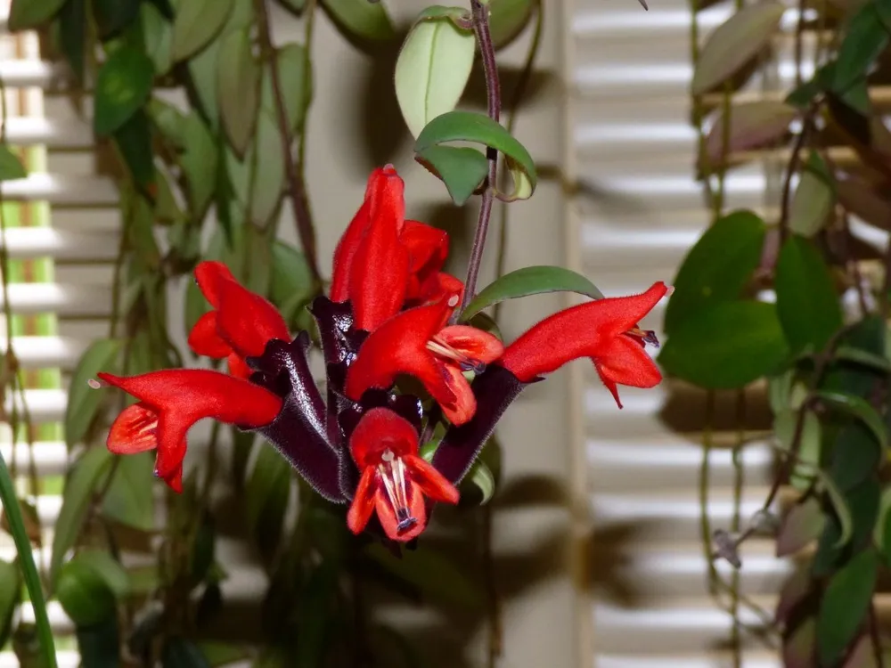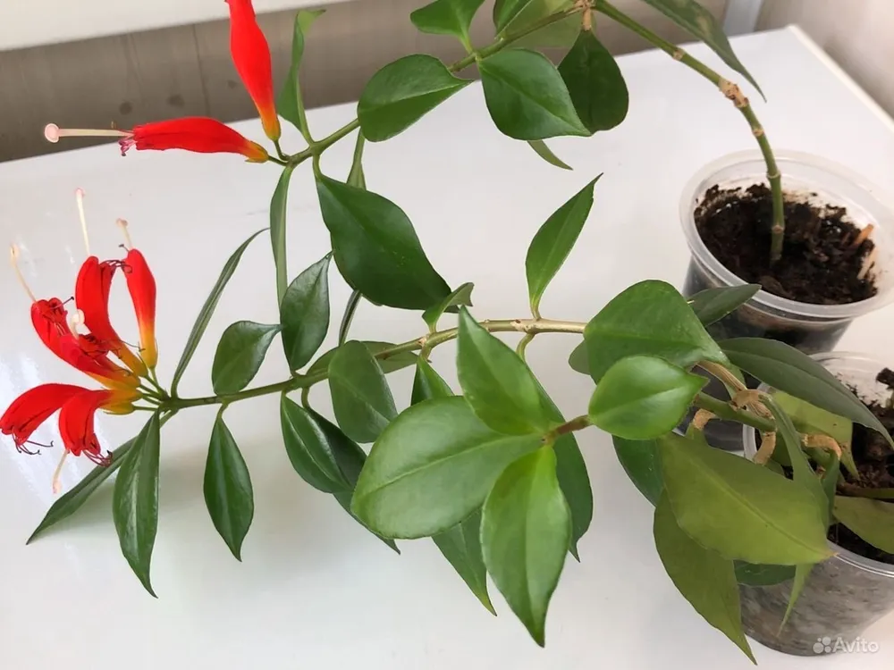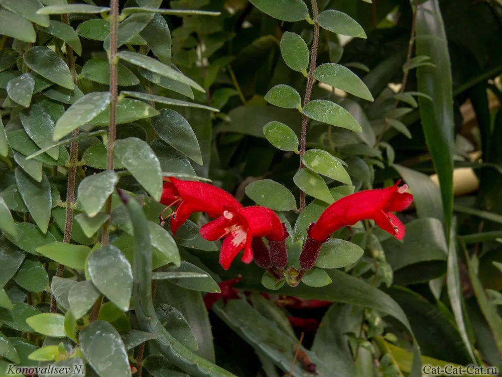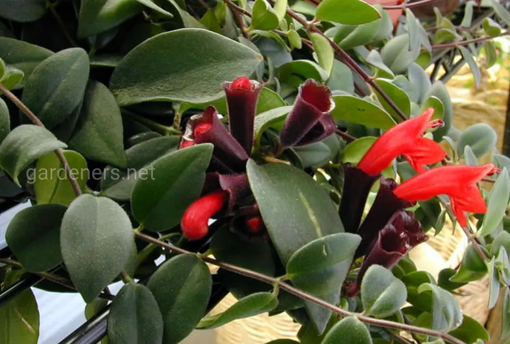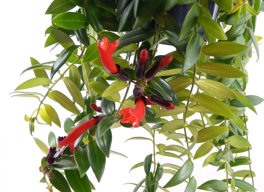 - Эсхинантус «Рассеянный» (Aeschynanthus radicans) – один из самых популярных сортов, с ярко-красными цветами и длинными свисающими побегами.