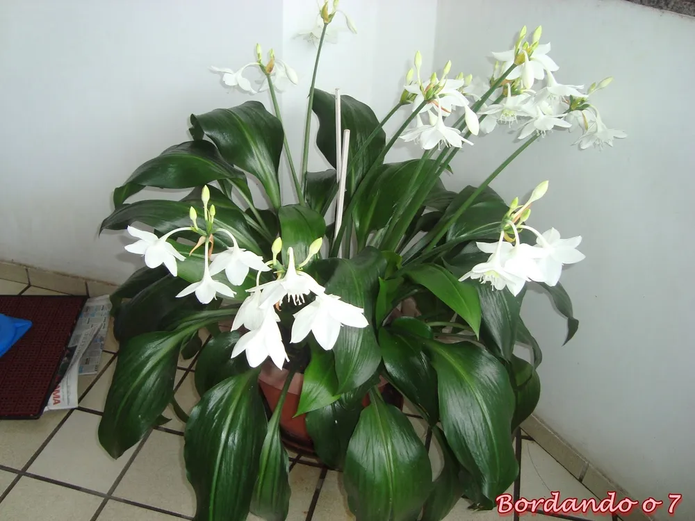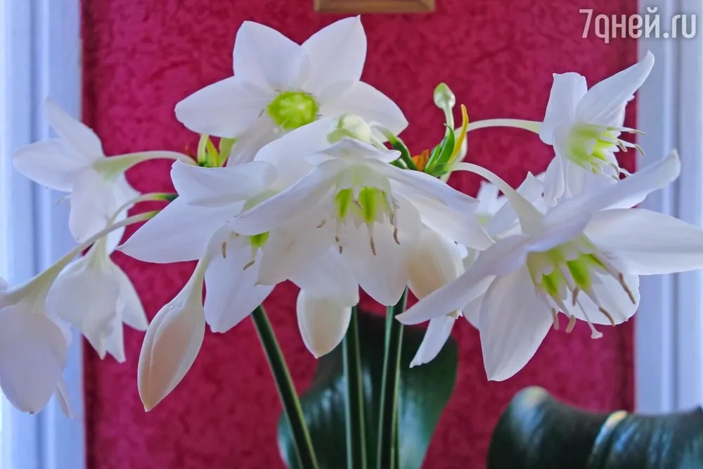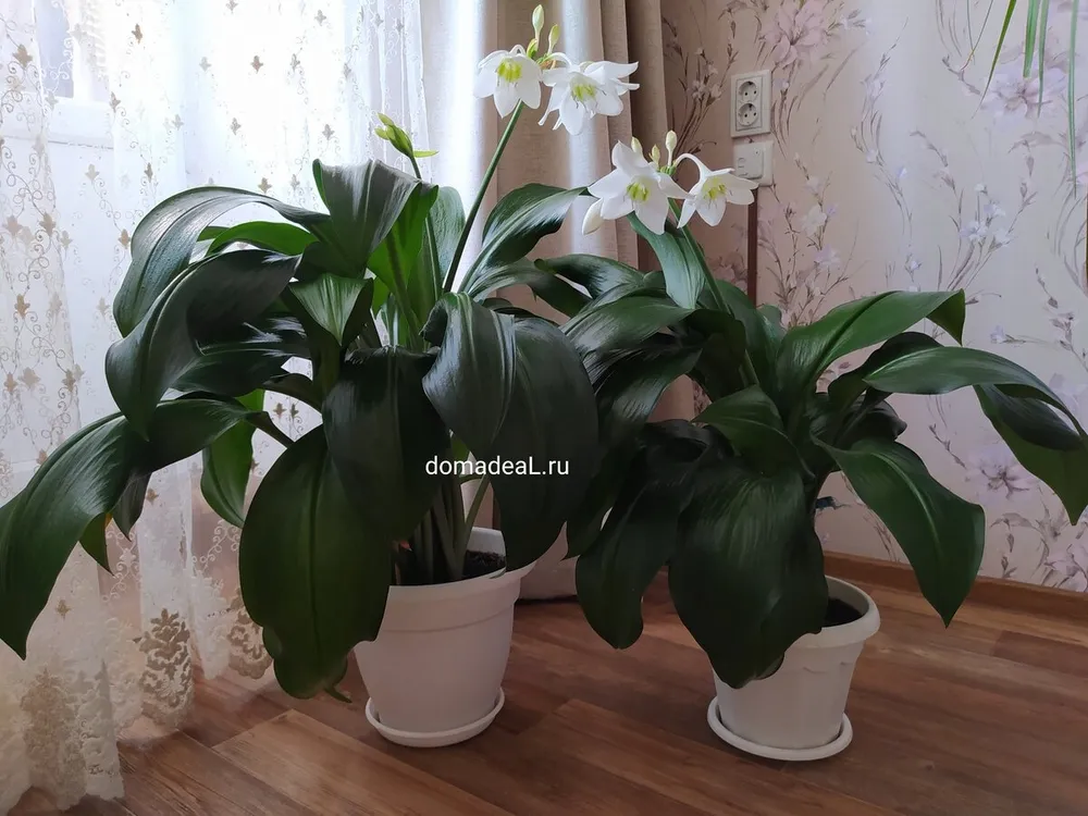 Эухарис, или амазонская лилия (Eucharis), принадлежит к семейству аmaryллисовых и славится своей изысканной красотой и необычной формой цветков. Это вечнозелёное растение из тропических лесов Южной Америки представляет собой настоящий экзот для любителей комнатных растений. Эухарис отличается крупными, глянцевыми листьями овальной формы, собранными в розетку у основания стебля. В период цветения, который обычно приходится на весну или лето, растение выпускает из центра розетки несколько цветоносов высотой до 40 см. На верхушке каждого цветоноса раскрывается удивительный цветок, похожий на колокольчик, с лепестками белого, кремового или пастельно-розового цвета и ярко выраженными тычинками, придающими ему особую изящность. Уход и выращивание эухариса Эухарис неприхотлив в уходе, но для того чтобы он радовал вас своим цветением, важно соблюдать определенные условия выращивания. #Освещение Эухарис предпочитает яркое, рассеянное освещение. Прямые солнечные лучи могут повредить листья растения. Лучшим местом для размещения эухариса будет восточная или западная сторона комнаты, где он сможет получать достаточное количество света. В течение дня растение должно находиться под прямыми солнечными лучами не более 2-3 часов. #Почва Для выращивания эухариса необходимо использовать рыхлую, хорошо дренированную почву с нейтральной или слабокислой реакцией (pH 6.0-7.0). Идеальной смесью для этой культуры будет комбинация листовой земли, дерновой земли и песка в соотношении 2:1:1. Также можно добавить к этой смеси немного торфяной земли для улучшения водоудерживающих свойств. #Полив Эухарис нуждается в регулярном поливе, но важно не переувлажнять почву. Полив следует проводить по мере подсыхания верхнего слоя почвы – примерно раз в 5-7 дней. Во время активного роста и цветения полив можно увеличить до 2-3 раз в неделю. При поливе необходимо использовать теплую, отстоявшуюся воду. Избегайте попадания воды на листья, так как это может привести к развитию грибковых заболеваний. #Подкормка Эухарис нуждается в регулярной подкормке во время вегетационного периода (с весны по осень). Для этого можно использовать жидкие удобрения для комнатных цветов с равномерным содержанием азота, фосфора и калия. Подкармливать растение рекомендуется раз в 2-3 недели, строго следуя инструкции на упаковке с удобрениями. В зимний период подкормку прекращают полностью. Формирование Эухарис не требует сложной обрезки, но регулярное удаление увядших листьев и цветоносов способствует его декоративности и здоровью. Если растение слишком разрослось и потеряло свою форму, можно обрезать стебли на уровне 10-15 см от земли. После этого эухарис начнет активно развиваться, пуская новые побеги. Сравнение с другими сортами Эухарис имеет ряд особенностей, которые отличают его от других представителей семейства аmaryллисовых: * **Форма и окраска цветков:** Цветы эухариса более крупные и похожи на колокольчики, чем у гиппеаструмов или нарциссов. Окраска лепестков чаще всего белая, кремовая или пастельно-розовая. * **Листья:** Листья эухариса крупнее и глянцевее, чем у большинства других аmaryллисовых. * **Период цветения:** Эухарис цветет обычно весной или летом, в то время как гиппеаструмы – осенью или зимой. Тонкости выращивания При выращивании эухариса важно помнить о его тропических к