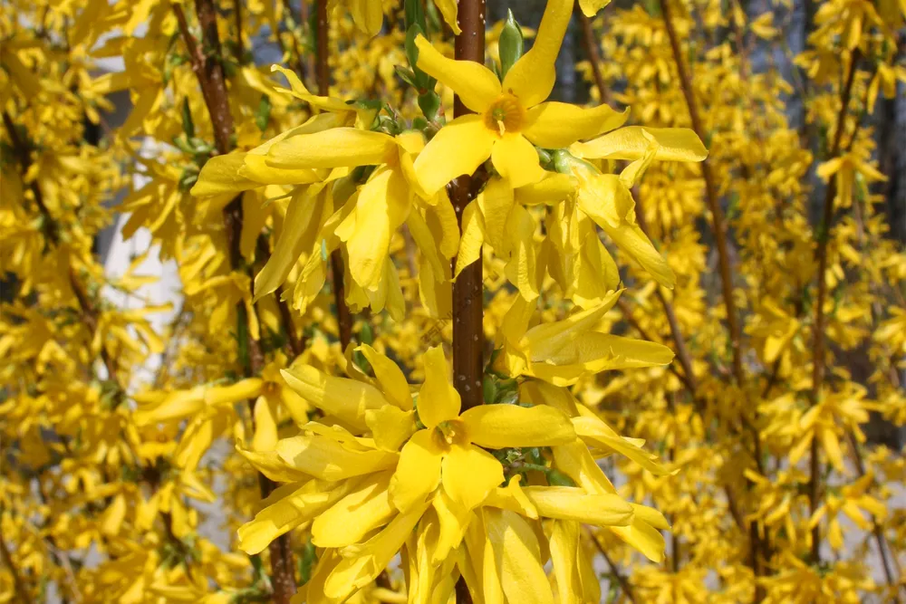 Форзиция овальная ‘Спринг Глори’ выделяется среди других сортов своей ранней весенней окраской и ярко-желтыми цветками.