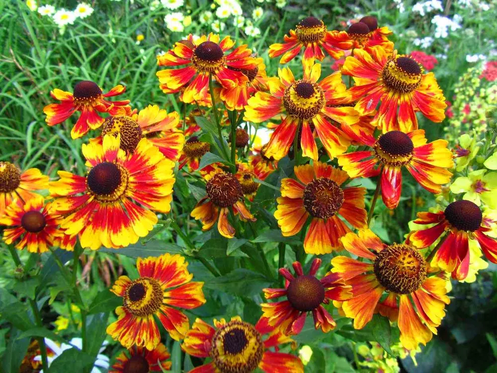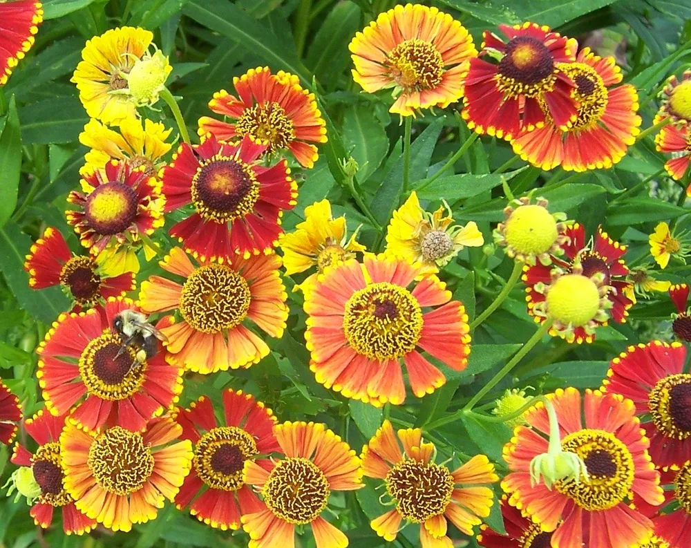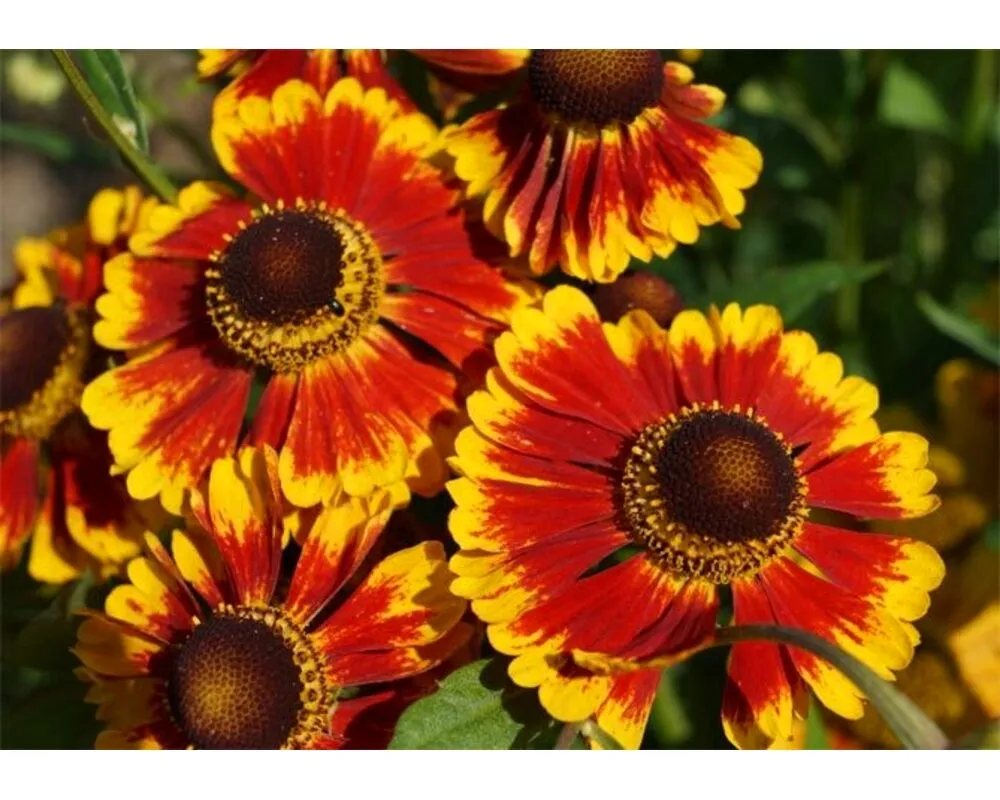 Гелениум осенний ‘Санрайз’ — это эффектный сорт, покоривший сердца цветоводов своим ярким окрасом и неприхотливостью в уходе. Отличительной чертой этого гелениума является его способность цвести до самой первой заморозки, радуя глаз с начала осени до поздней осени. Благодаря этому он стал одним из самых популярных сортов для осенних садов. ‘Санрайз’ — это результат селекционной работы, направленной на создание новых форм гелениума с более продолжительным цветением и яркими красками. Этот сорт был выведен сравнительно недавно, но уже успел завоевать признание благодаря своей красоте и неприхотливости. Уход за Гелениумом осенним ‘Санрайз’ #Освещение Гелениум осенний ‘Санрайз’, как и большинство представителей своего рода, предпочитает солнечные места с не менее 6 часов прямых солнечных лучей в день. Однако он достаточно вынослив и может расти и цвести в полутени. В тени цветки будут мельче и их окрас будет более бледным. #Почва Для обильного цветения гелениуму ‘Санрайз’ требуется плодородная, дренированная почва с нейтральной реакцией pH (6,0-7,0). Лучше всего он растет в почве с хорошим содержанием питательных веществ, богатой органическими веществами. #Полив Гелениум осенний ‘Санрайз’ относительно засухоустойчив, но нуждается в регулярных поливах, особенно в период вегетации и цветения. Оптимальный режим полива — умеренный, с обязательной просушкой верхнего слоя почвы между поливами. Переувлажнение может привести к гниению корней. **Важно!** Не перекармливайте гелениум: избыток влаги может стать причиной болезней. #Подкормка Гелениум осенний ‘Санрайз’ отзывчив на подкормки, которые способствуют обильному цветению и здоровому росту. В период активного роста (весна-лето) рекомендуется вносить азотно-фосфорные удобрения каждые 2-3 недели. **Совет:** Для обеспечения полноценного питания можно использовать комплексные минеральные удобрения, содержащие макро- и микроэлементы. Формирование Гелениум осенний ‘Санрайз’ не требует сложного формирования. В период вегетации можно прищипывать верхушки побегов для стимулирования ветвления и более пышного цветения. Сравнение с другими сортами Гелениум осенний ‘Санрайз’ выделяется среди других сортов гелениума своей продолжительностью цветения, ярким окрасом цветков и неприхотливостью в уходе. Например, сорт ‘Autumn Splendor’ цветет несколько короче, а ‘Moerheim Beauty’ отличается более светлыми оттенками цветов. Тонкости выращивания * Для обеспечения хорошего дренажа почвы можно смешать ее с песком или гравием. * Гелениум осенний ‘Санрайз’ может быть поражен вредителями и болезнями, такими как мучнистая роса и гнили корней. Для профилактики заболеваний необходимо обеспечить хорошую аэрацию почвы и своевременно удалять больные растения. Мнение автора и общий вывод Гелениум осенний ‘Санрайз’ — это прекрасный выбор для тех, кто хочет украсить свой сад яркими цветами до самой поздней осени. Этот сорт неприхотлив в уходе, устойчив к болезням и прекрасно смотрится в различных композициях. Его продолжительное цветение и яркий окрас создают неповторимый осенний ансамбль в саду.