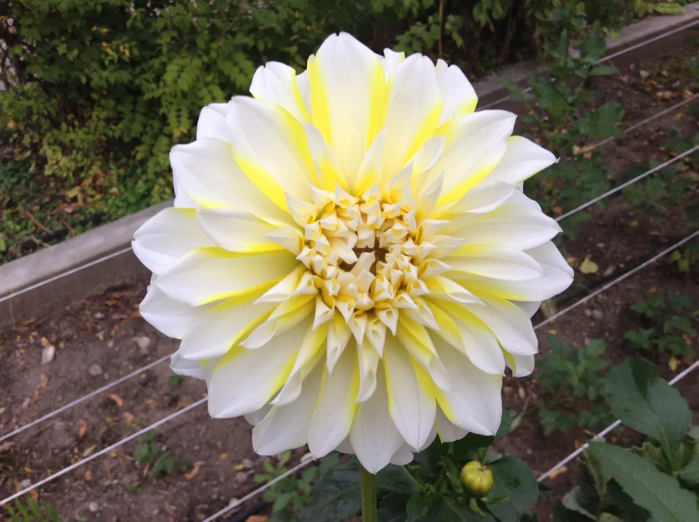 По мере роста кустов георгин нужно подвязывать к опоре, чтобы стебли не ломались под тяжестью крупных цветов.