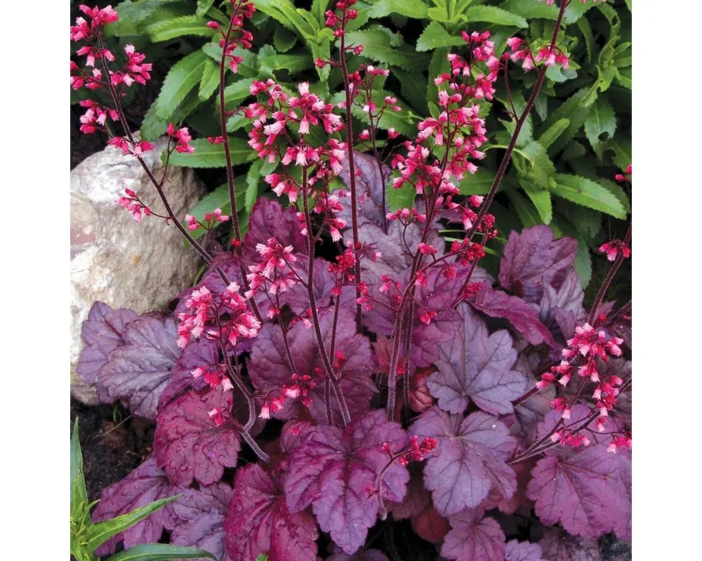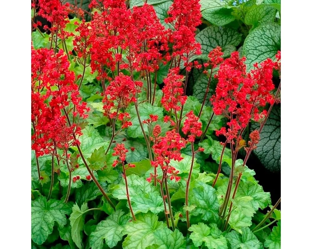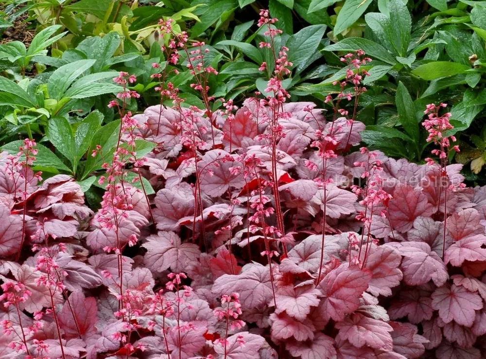 Гейхера кроваво-красная отличается яркой окраской листьев, которые варьируются от насыщенного винного до глубокого карминного цвета. Ее название, «кровно-красная», говорит само за себя – именно этот цвет преобладает на ее декоративных листьях. В летнее время на гейхере кроваво-красной появляются небольшие колокольчатые цветы лилового или розового оттенка, собранные в соцветия.
