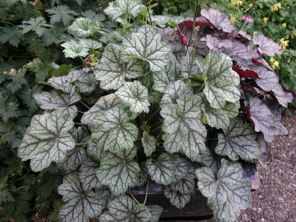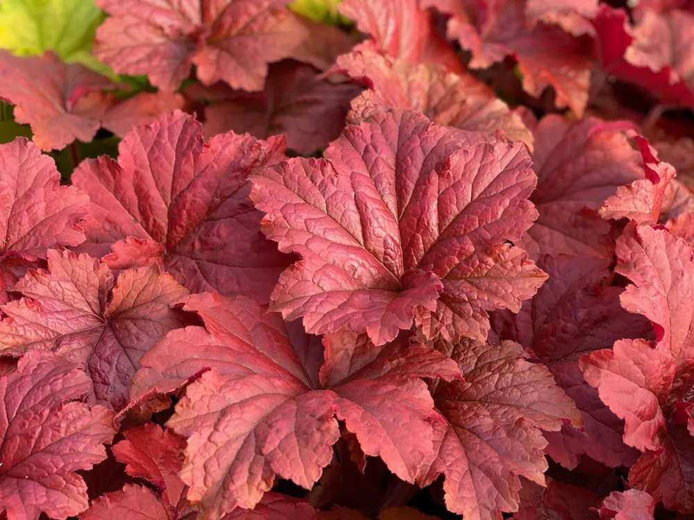 Гейхера ‘Отумн Ливс’ отличается от других сортов гейхеры своим ярким окрасом листьев. В отличие от многих сортов, у которых листья имеют однотонный или пестрый рисунок, у ‘Отумн Ливс’ листья украшены красивыми красными прожилками и пятнами.