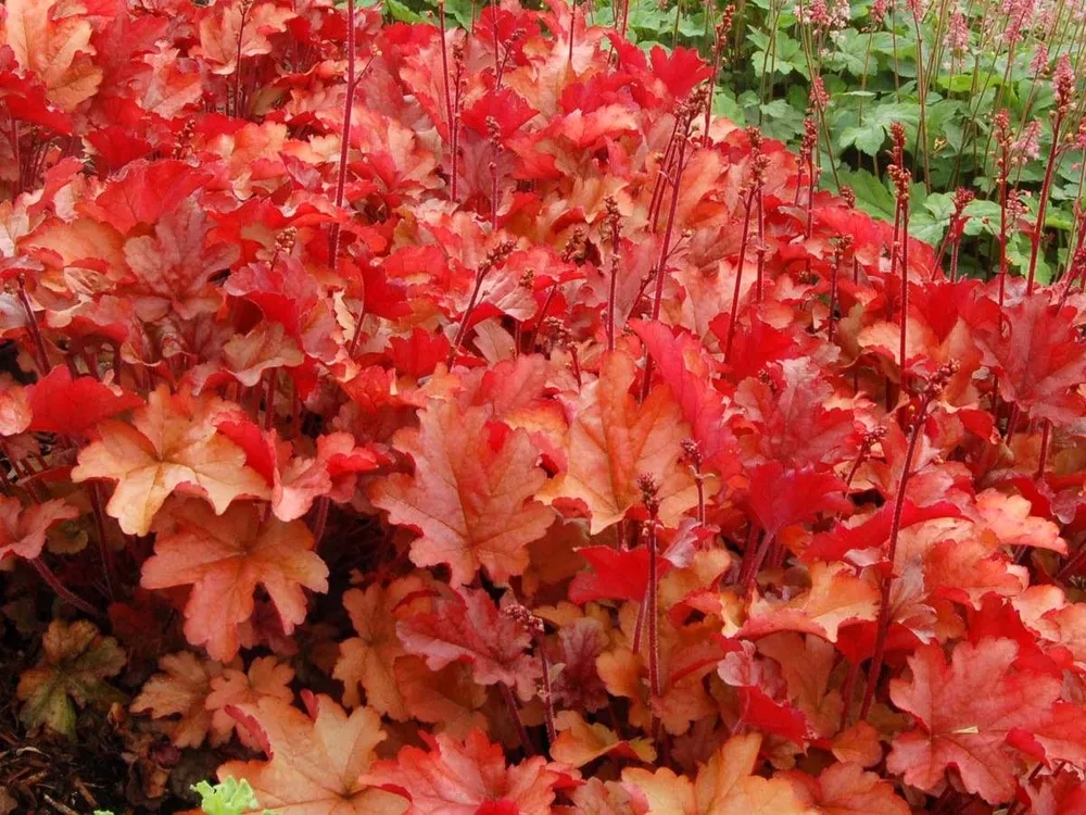 Гейхера Паприка выделяется среди других сортов гейхеры своим ярким окрасом листьев.