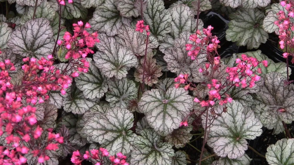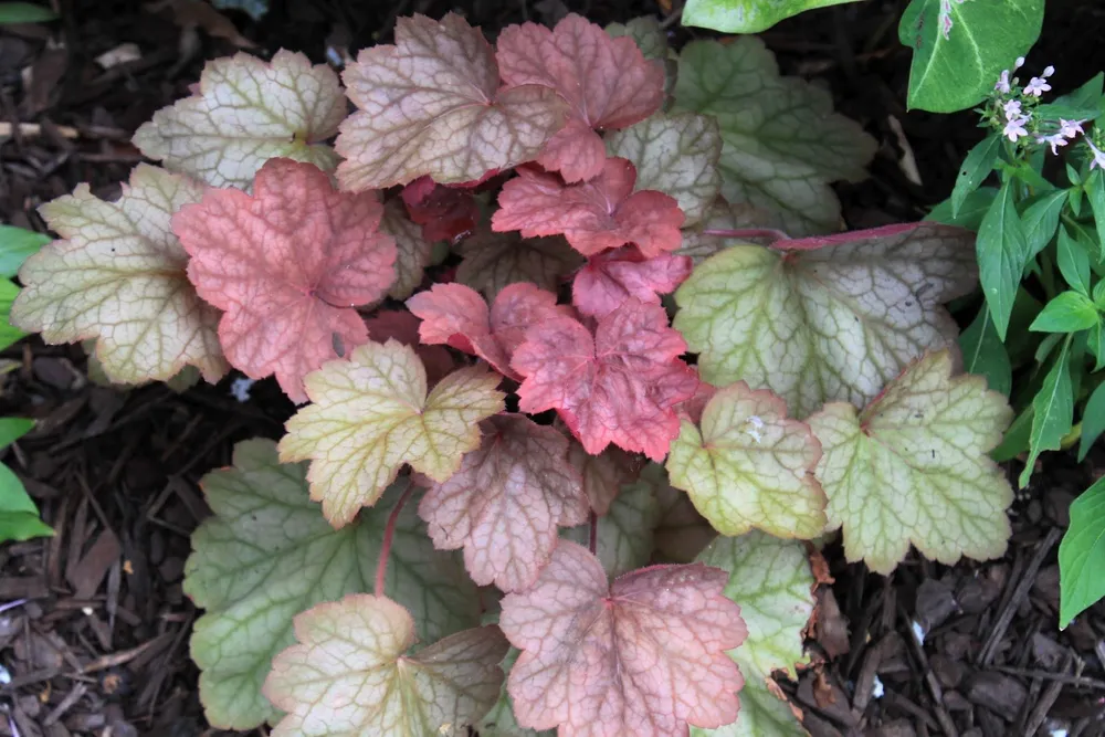 Гейхера Роуз Кварц выделяется среди других сортов своей необычной окраской листьев.