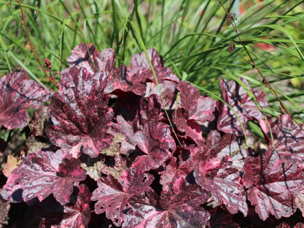 Эта гейхера выделяется из ряда других своей оригинальной окраской листьев. В центре пластинки преобладает насыщенный розовый оттенок, а к краям переходит в глубокий бордовый. Цветы этого сорта не так ярки, как листья, но они тоже украшают куст своим присутствием. Нежно-розовые цветки собраны в небольшие соцветия и появляются на верхушках побегов.