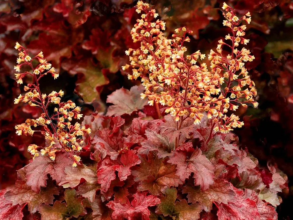 Гейхера ‘Рут Бир’ отличается от других сортов гейхеры своей необычной окраской листьев: глубокие красные оттенки на фоне изумрудного фона. ‘