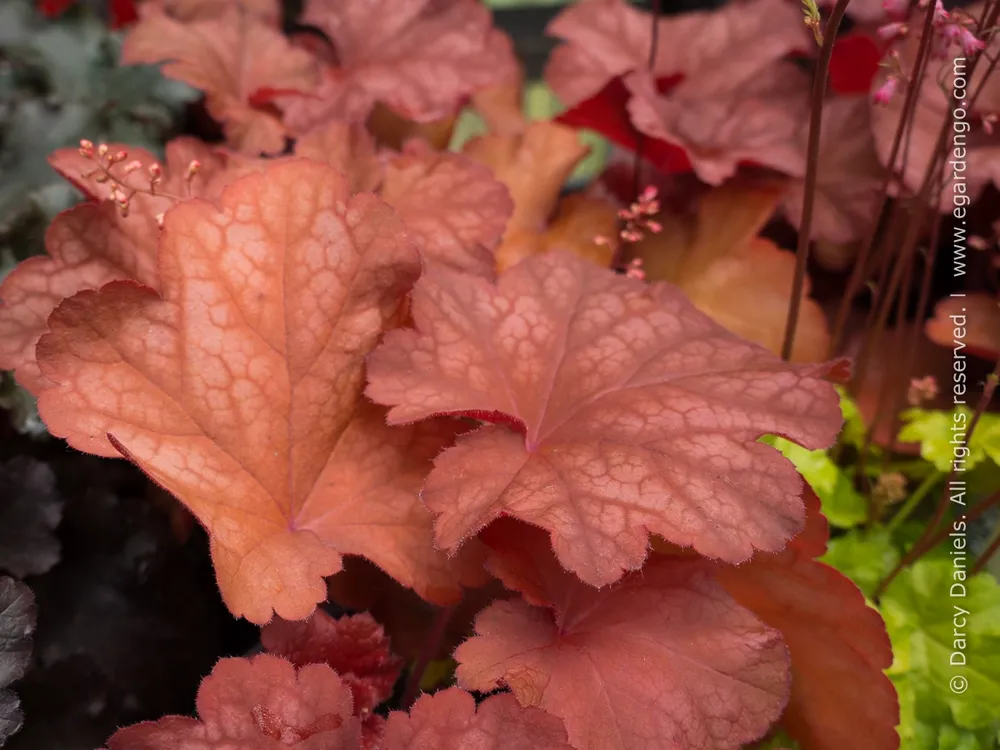 Растение представляет собой компактный кустик высотой до 40 см с широкими, сердцевидными листьями необычного оттенка – они имеют серебристо-зеленую основу с глубокими пурпурными прожилками и красными крапинками по краю. Цветки Шуга Плам мелко-колокольчатые, лилово-розовые, собраны в соцветия на высоких цветоносах, достигающих до 60 см.