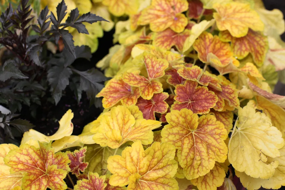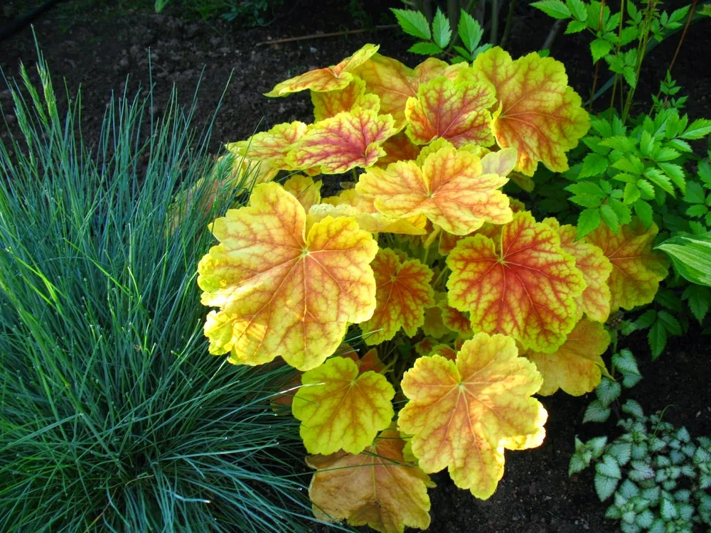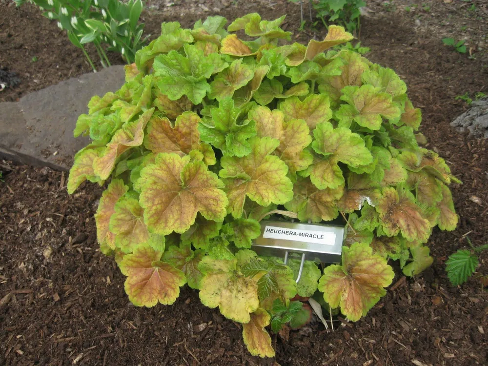 Гейхера Тирамису выделяется среди других сортов гейхер своим необычным рисунком листьев. В отличие от многих других сортов, у которых листья имеют однотонную окраску, у Тирамису они украшены кремовыми пятнами, что придает растению особую изюминку.
