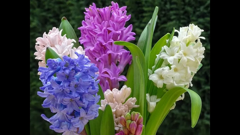 Гиацинт существует в большом количестве сортов: * **’Blue Jacket’**: Этот сорт отличается синими цветами с белой каймой, * **’City of Haarlem’**: Отличается яркой розовой окраской, * **’Carnegie’**: имеет белые цветы с фиолетовыми пятнами. Каждый сорт обладает своими уникальными характеристиками по высоте, оттенкам и аромату.
