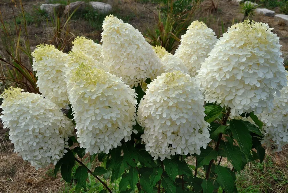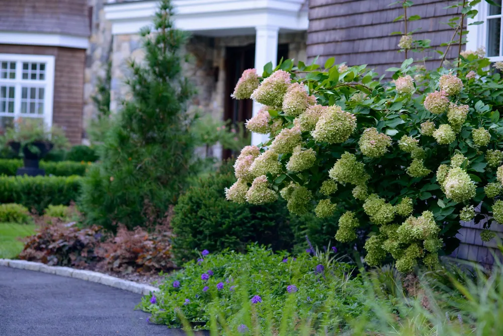 Крупные гортензии также отличаются от других декоративных кустарников своей необычной формой цветения. Цветение может быть шарообразным, плотным, коническим или зонтичным, что позволяет им создавать разнообразные цветовые акценты в саду.