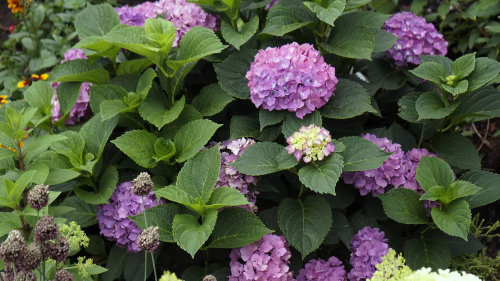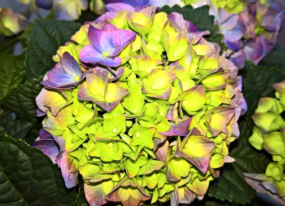 Гортензия крупнолистная ‘Хамелеон’ выделяется среди других сортов своей уникальной способностью менять окраску цветков в зависимости от кислотности почвы.