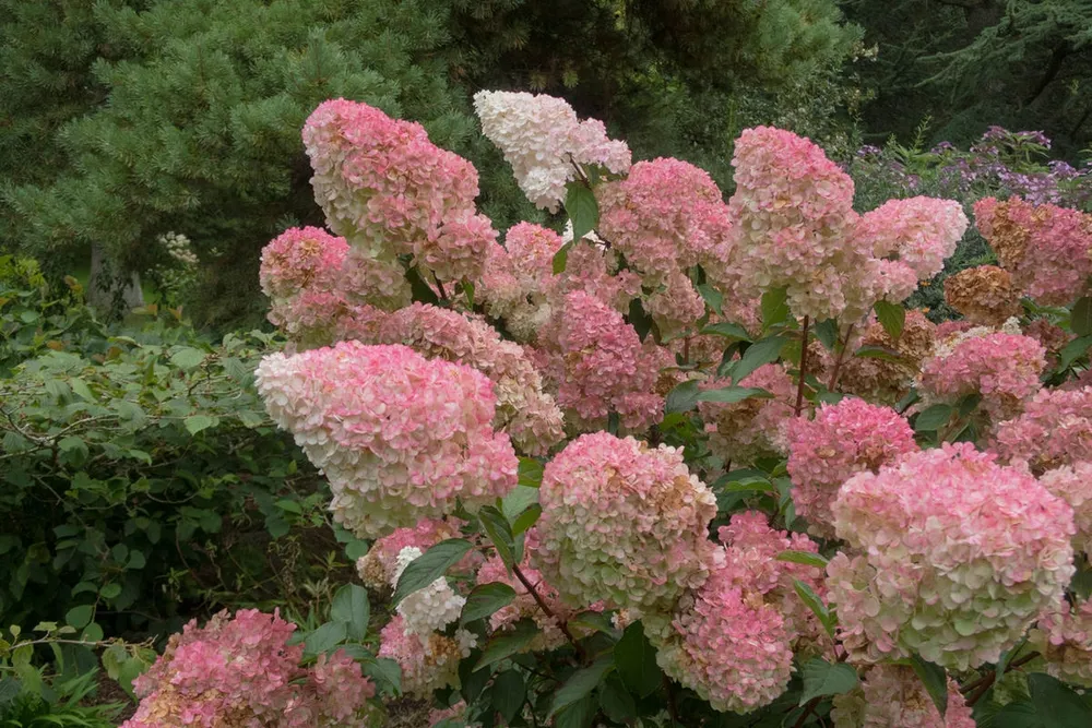 Гортензия метельчатая имеет много сортов, отличающихся формой цветков, окраской, высотой растения. Например, сорт ‘Annabelle’ — это крупный кустарник с белыми шаровидными соцветиями диаметром до 30 см. Сорт ‘Limelight’ отличается своими кремово-зелеными соцветиями, которые постепенно приобретают розовую окраску.