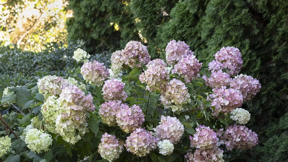 ‘Пинки Промис’ выделяется среди других сортов метельчатых гортензий своей необычной окраской цветков, которая меняется в течение сезона.