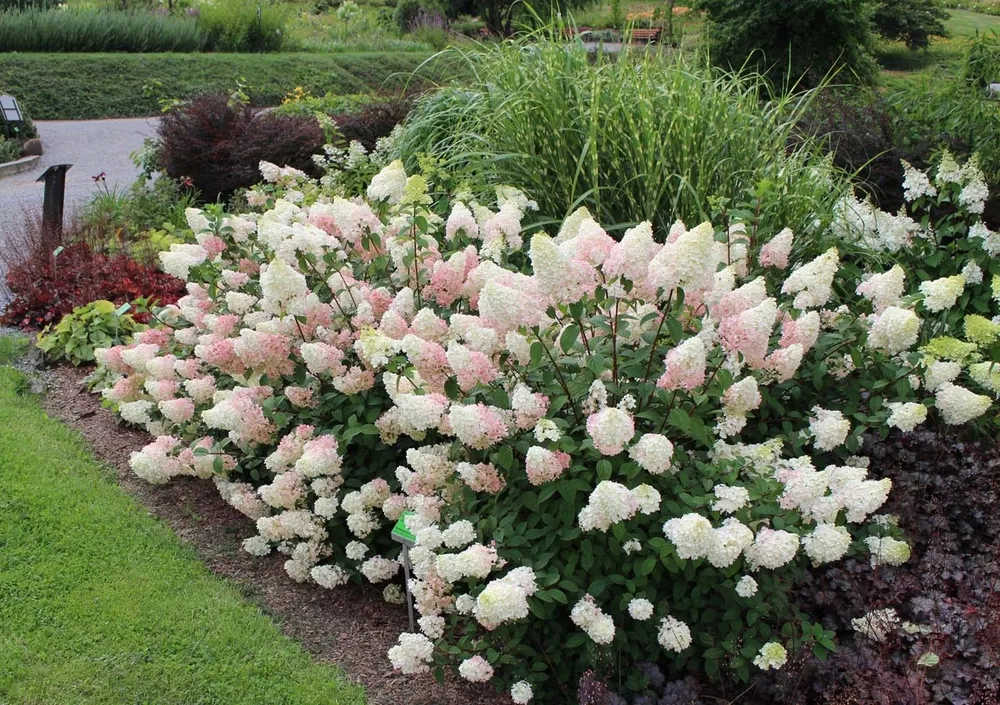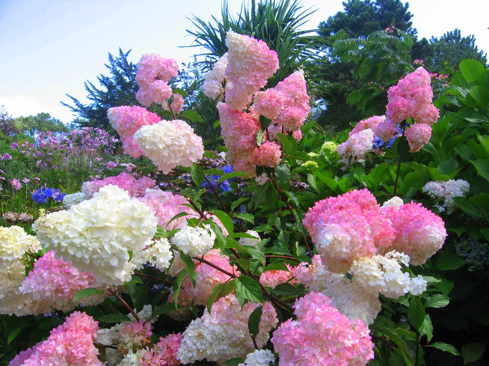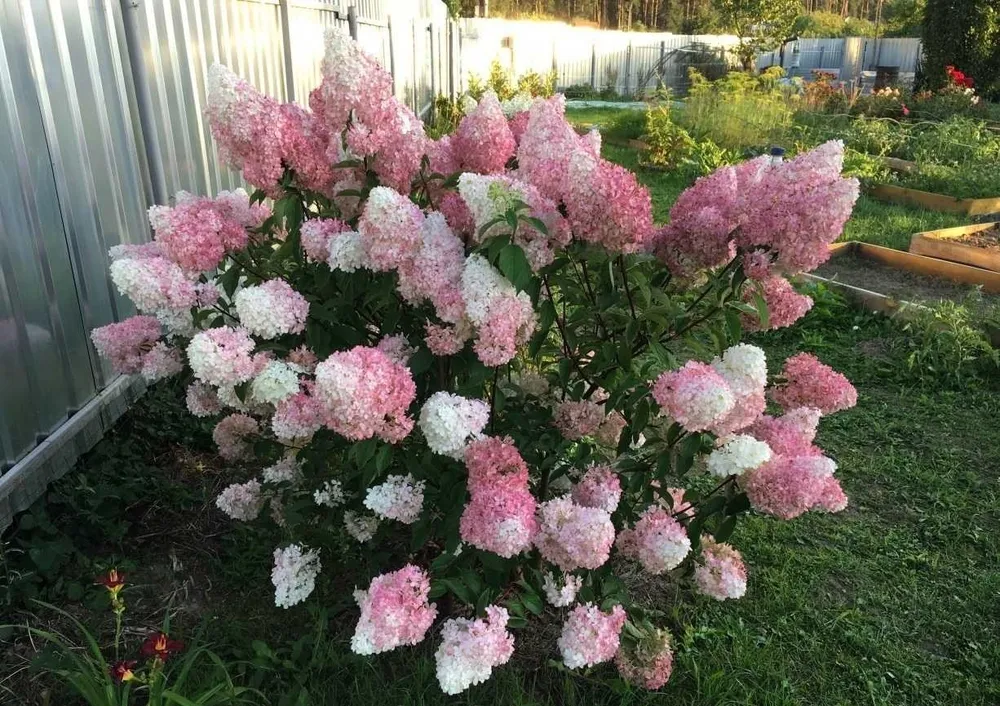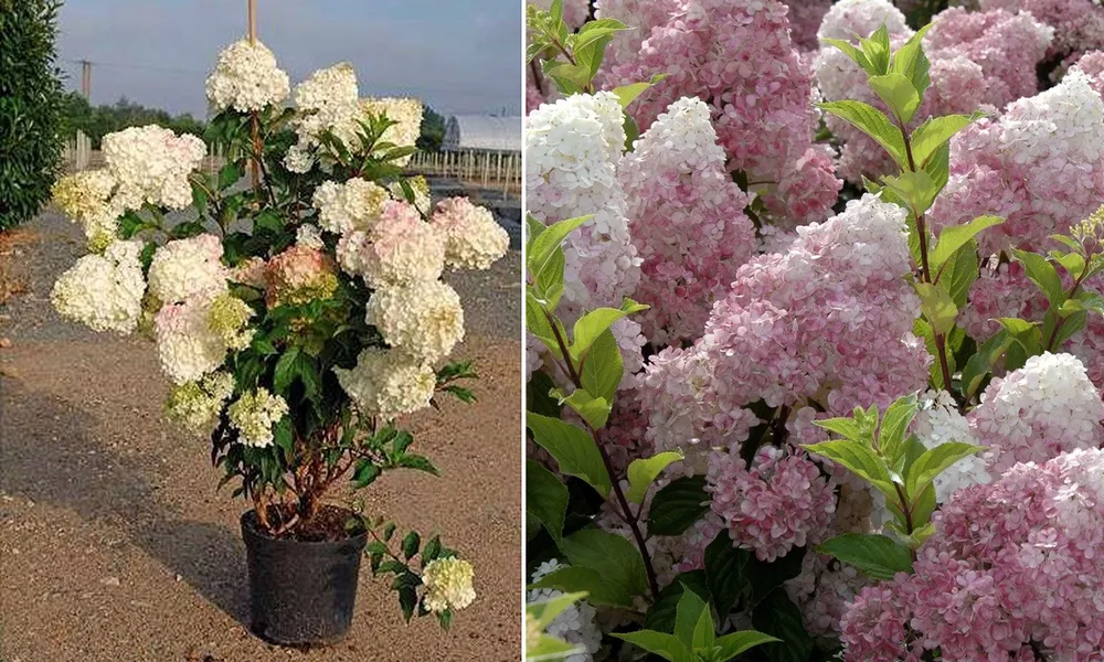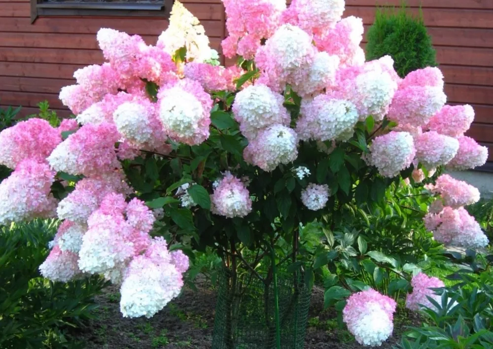 Гортензия ‘Ванилла Фрейз’ отличается от других сортов метельчатых гортензий своей уникальной цветовой гаммой. Ее нежно-кремовые соцветия с легким розовым оттенком придают саду романтичный и воздушный вид.