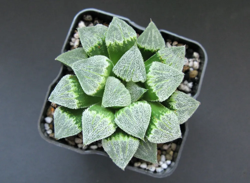 Эти растения представляют собой небольшие суккуленты, достигающие в высоту от нескольких сантиметров до 15-20 см. Листья хаворитий собраны в розетки и имеют плотную текстуру, покрытую мелковолосистым или гладким напылением. Поверхность листьев может быть однотонной или украшена различными узорами: полосами, пятнами, точками. Цвет листьев варьируется от зеленого до синевато-зеленого, а также встречаются сорта с розовыми, фиолетовыми и красными оттенками.