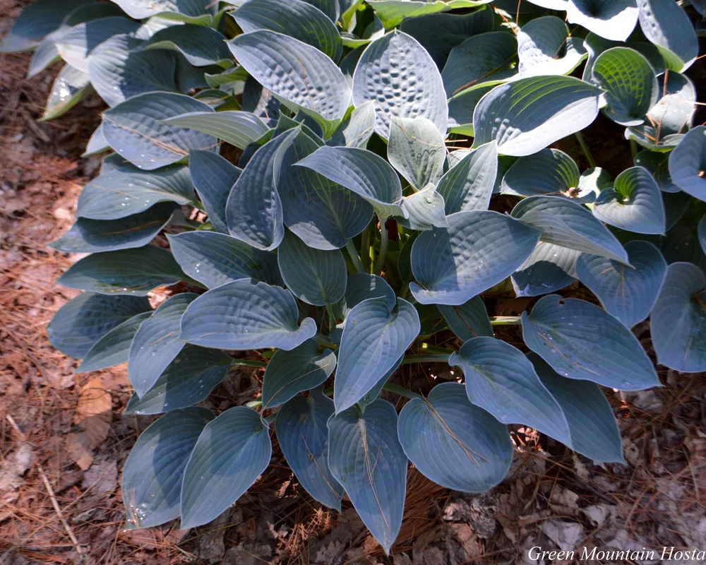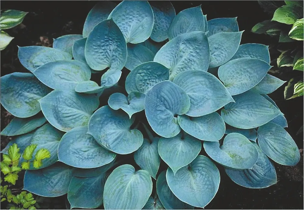 Листья Хосты Блю Вижн обладают насыщенной сине-голубой окраской с широкой белой каймой по краю. Эта эффектная комбинация цветов создает яркий контраст и придает растению особую изюминку. К концу лета листья приобретают более глубокий, почти фиолетовый оттенок, что еще больше подчеркивает их красоту. Хоста Блю Вижн отличается густой, компактной розеткой листьев, которая достигает в диаметре до 50 см.