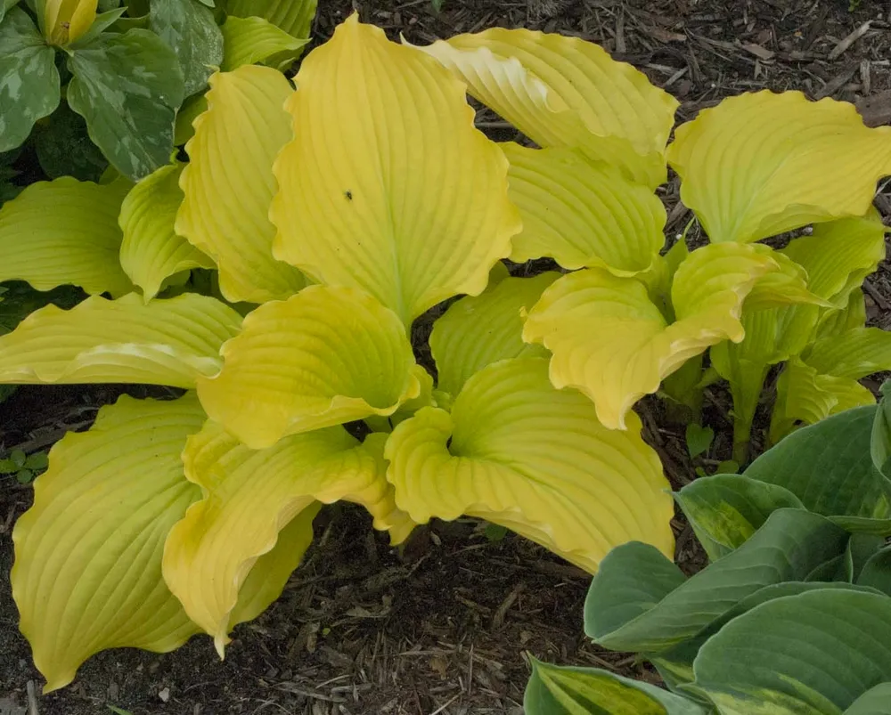Хоста Санни Халцион отличается от других сортов хосты своей яркой окраской листьев. Листья у хосты Санни Халцион имеют интенсивный зеленый цвет, с золотисто-желтыми прожилками и широкими полосами кремового цвета по краям. Это создает контрастный и привлекательный эффект.