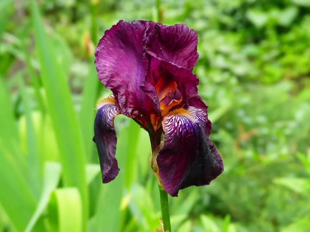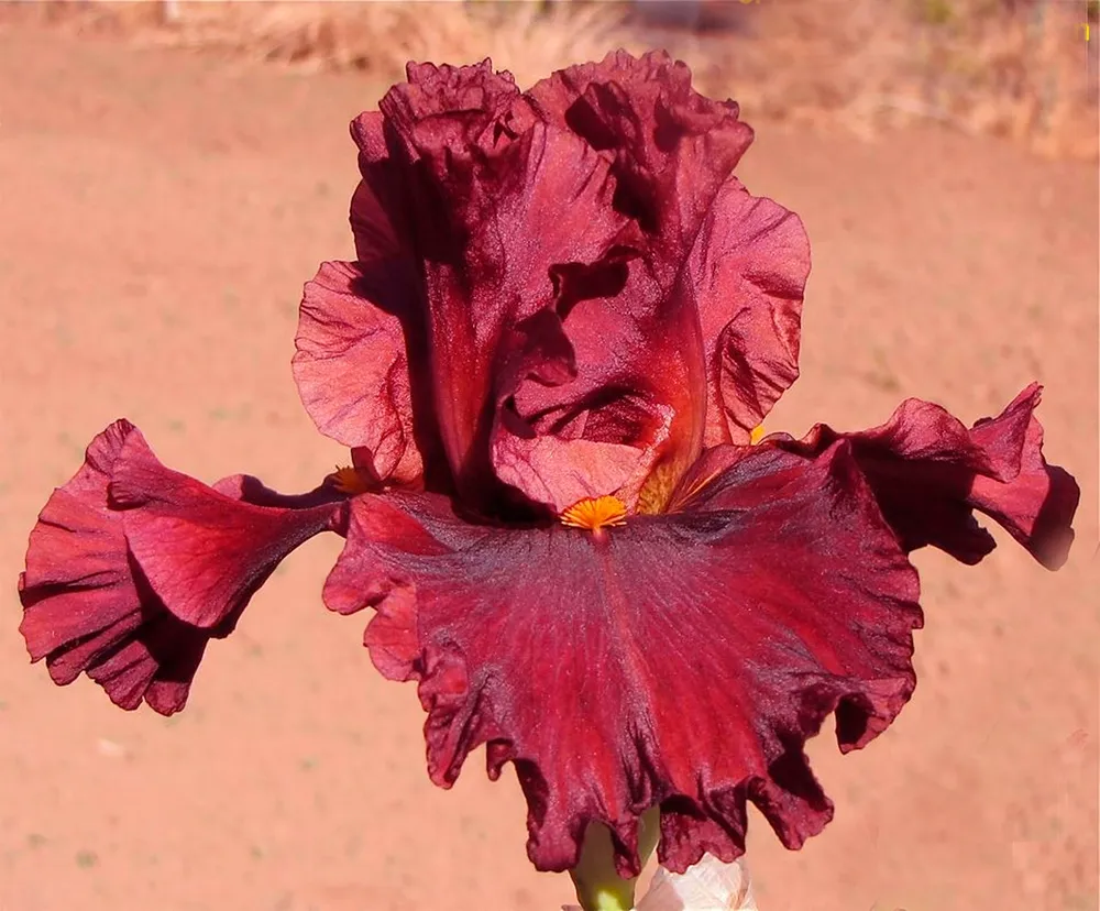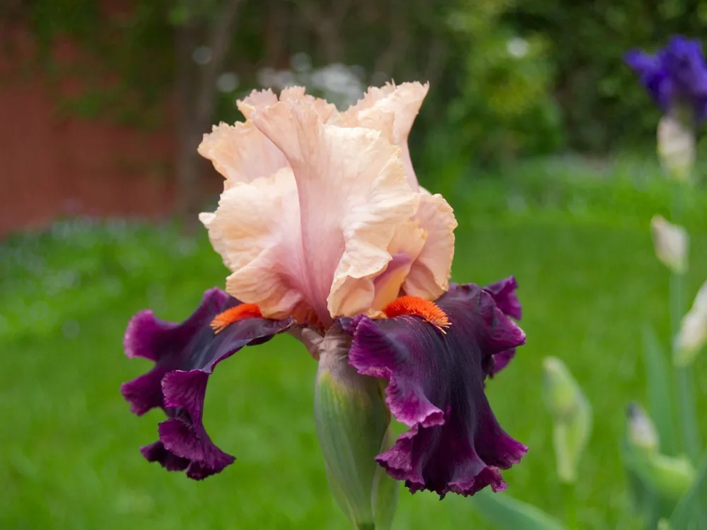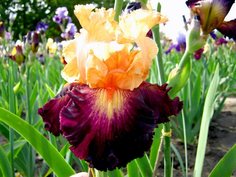 Сорт характеризуется крупными цветами насыщенного пурпурного цвета с золотисто-желтыми отметинами на пепелистой почве лепестков. Период цветения приходится на май – июнь, при этом одна луковица может дать до 5 цветков одновременно. Высота растения достигает 60-70 сантиметров, что позволяет успешно использовать Ирис Кармен для оформления клумб и бордюрных посадок.