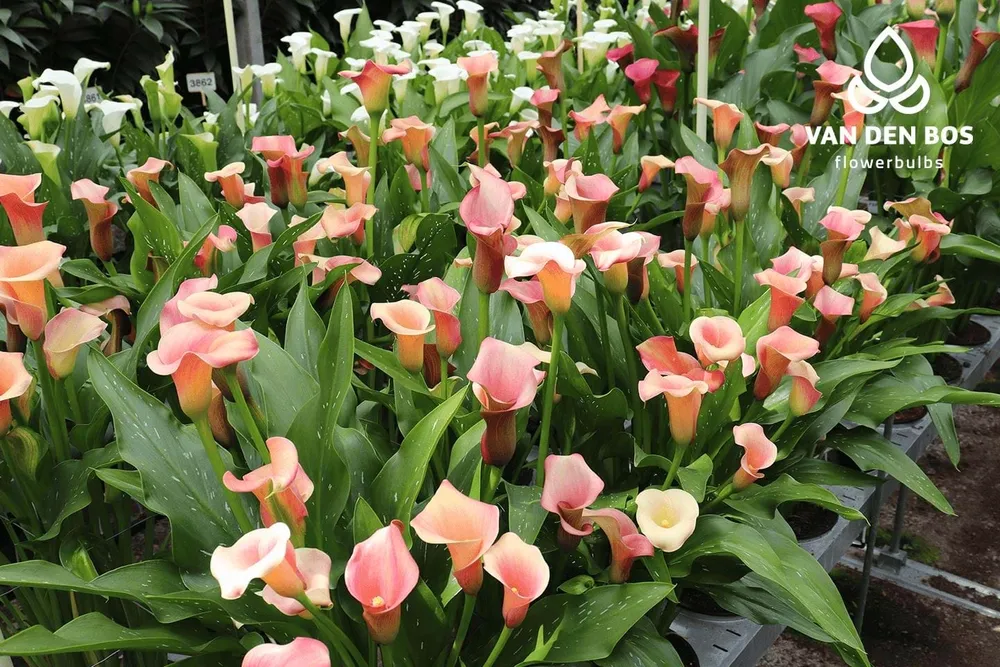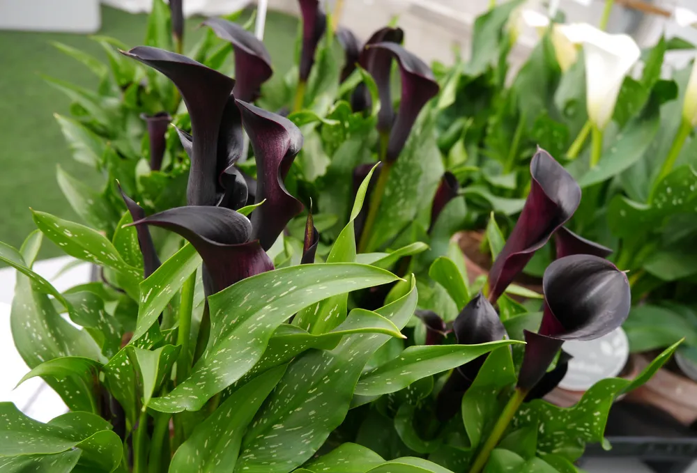 Эта калла отличается крупными, темно-зелеными листьями, которые создают красивую контрастную основу для ее ярких соцветий.