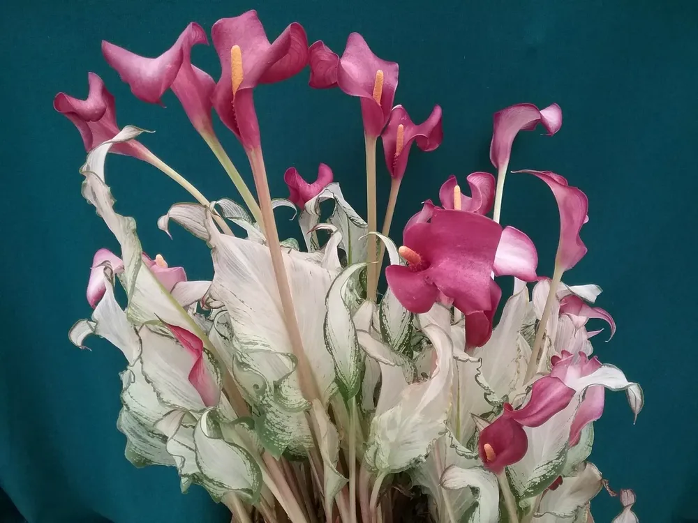 Например, у Калла Зумбо или Калла Микс цвет листьев более однородный и яркий, в то время как у Калла Кристал Блаш листья имеют более сложный рисунок с легкими переходами между оттенками.