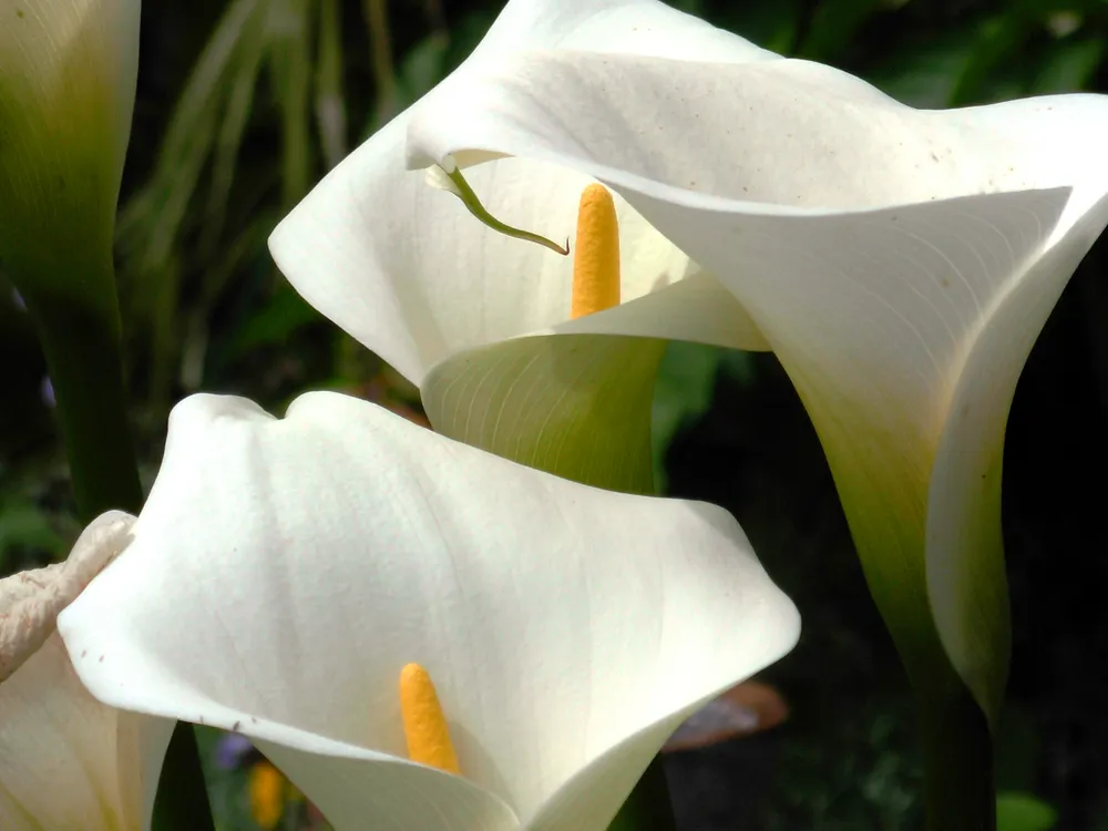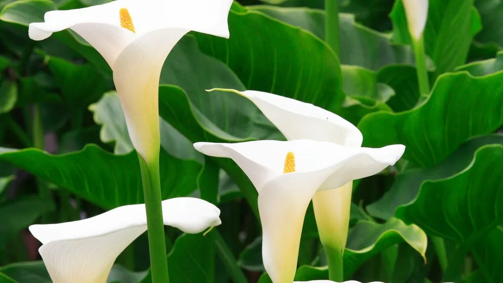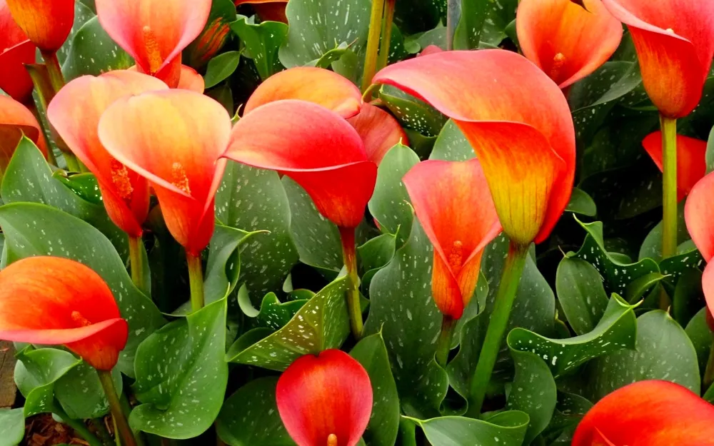 Калла «Манго» выделяется среди других сортов своей яркой и насыщенной окраской, напоминающей созревшие манго. Сорт «Снежная королева» имеет белые махровые цветы, а «Кармина» – ярко-красные цветки.