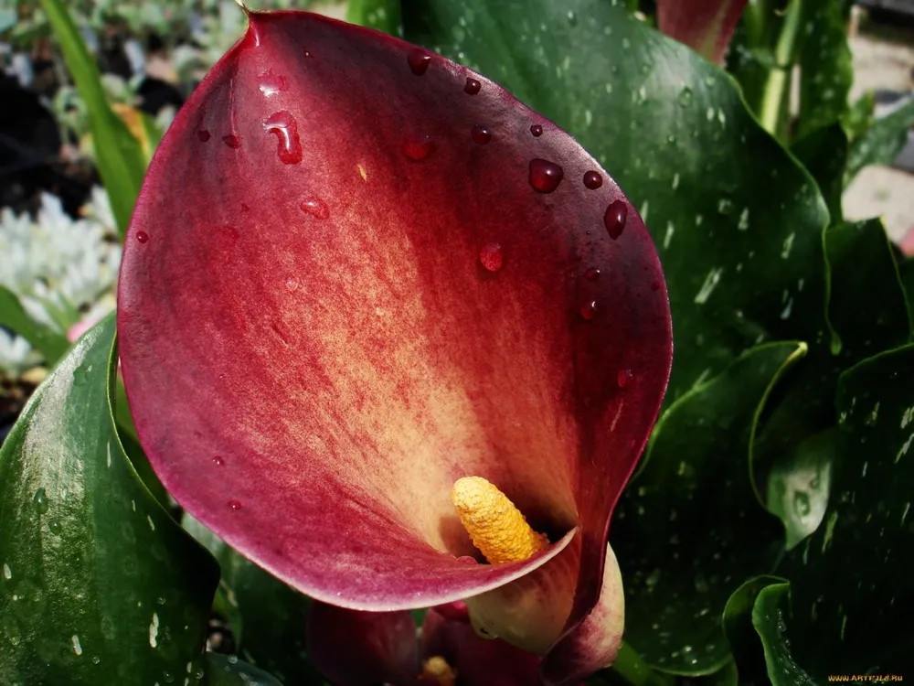 Цветок этого сорта привлекает внимание своей формой: он напоминает стилизованную чашу, которая раскрывается словно лепестки. Благодаря своему необычному окрасу, Калла Ред Алерт стала настоящей звездой садовых композиций и любимым украшением клумб.