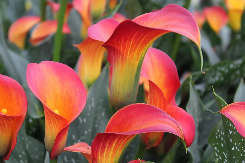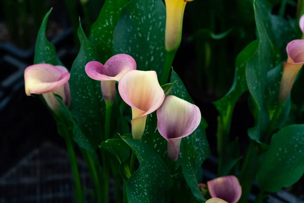 Каллы ‘Picasso’ обладают пятнистыми листьями, что придает им особый шарм.
