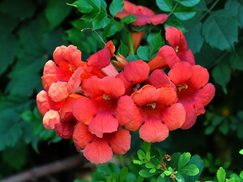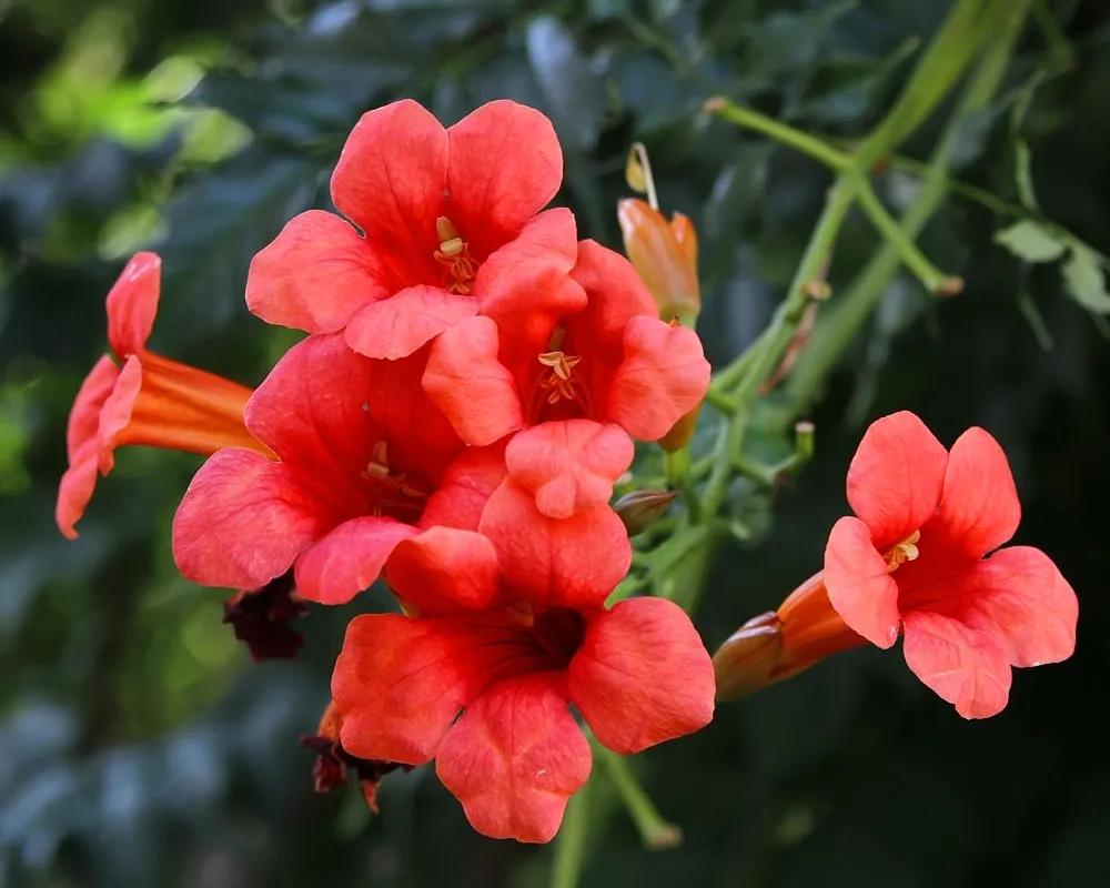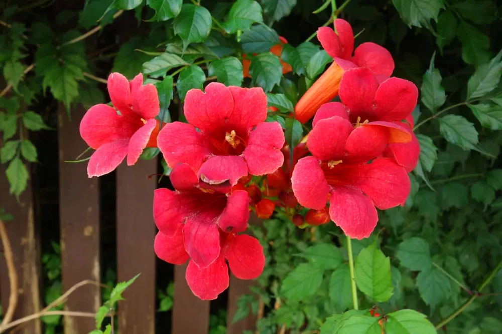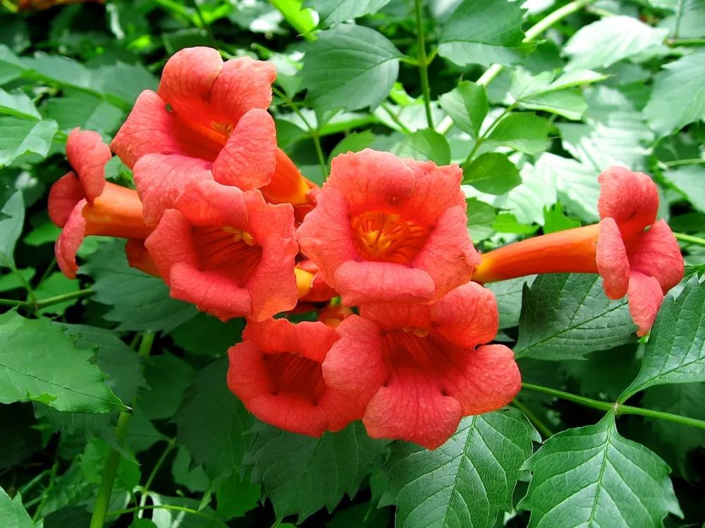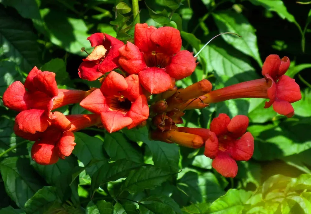 Кампсис укореняющийся Фламенко отличается от других сортов своей яркой окраской цветков.