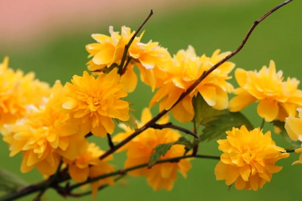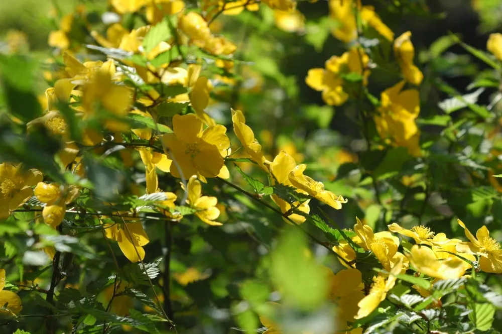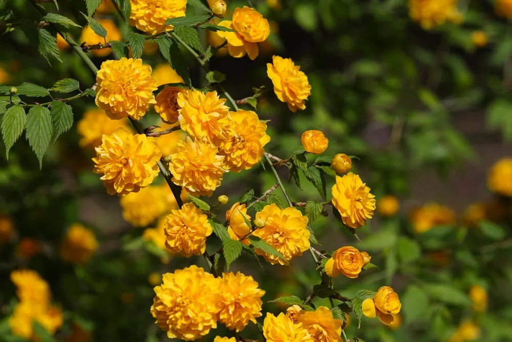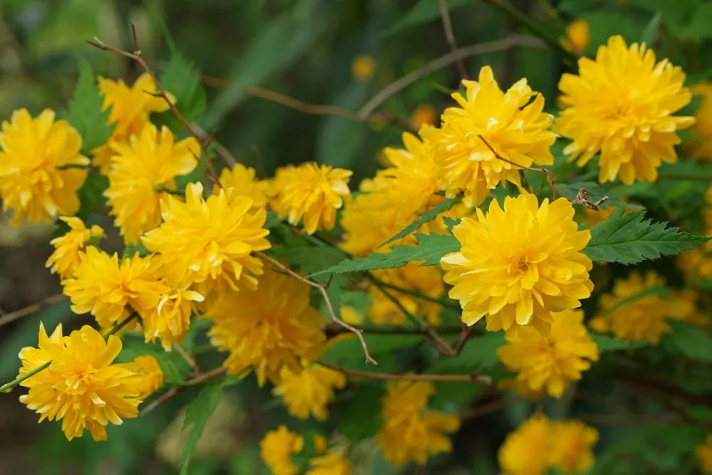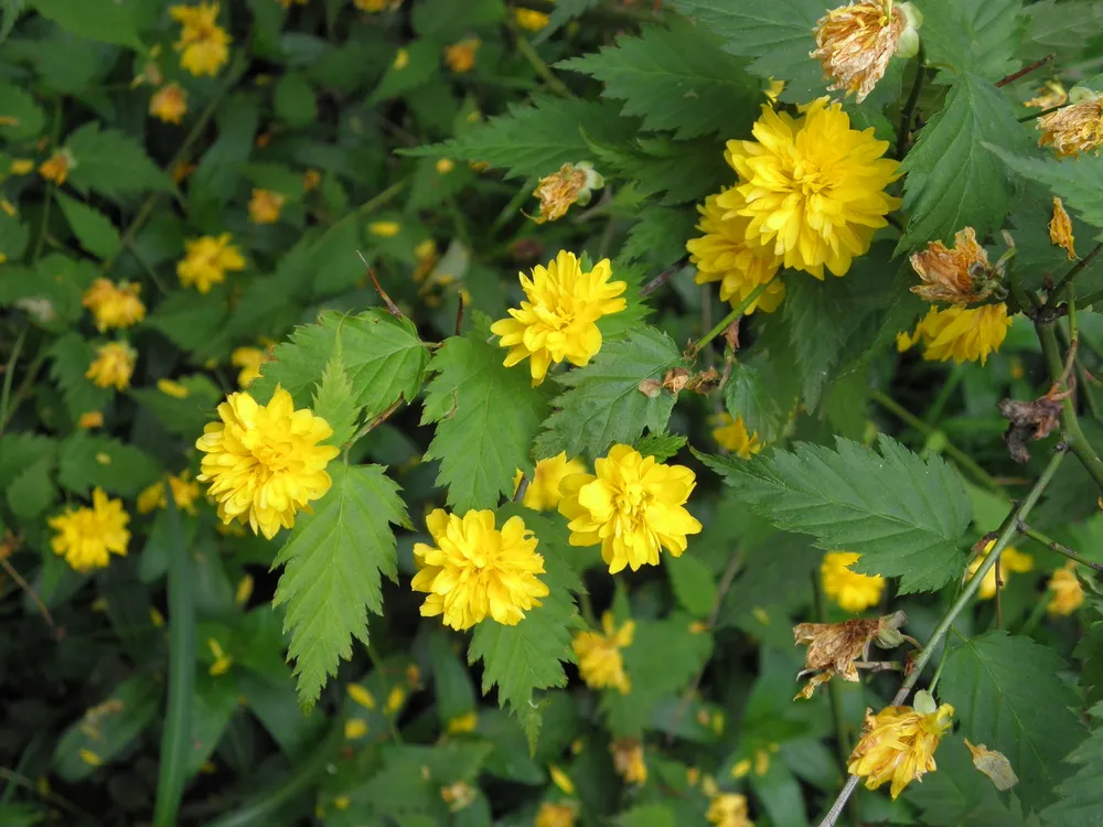 Керрия может расти в форме куста высотой до 1.5 метров. При необходимости ее можно прищипнуть для поддержания компактной формы и стимуляции ветвления. Удаление увядших цветков (после цветения) также способствует более обильному цветению в следующем сезоне.