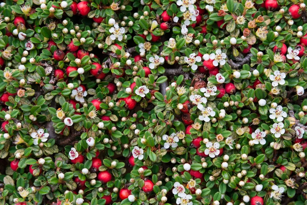 Кизильник дугообразный ‘Декорус’ отличается от других сортов своей яркой, декоративной листвой и обильным цветением.