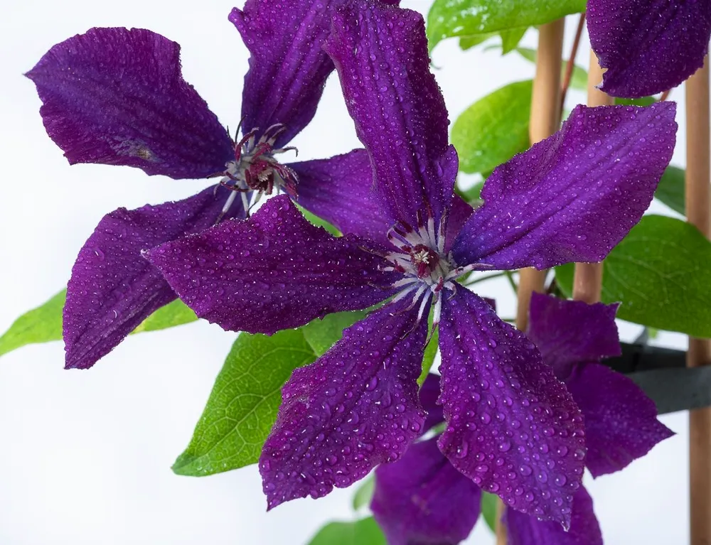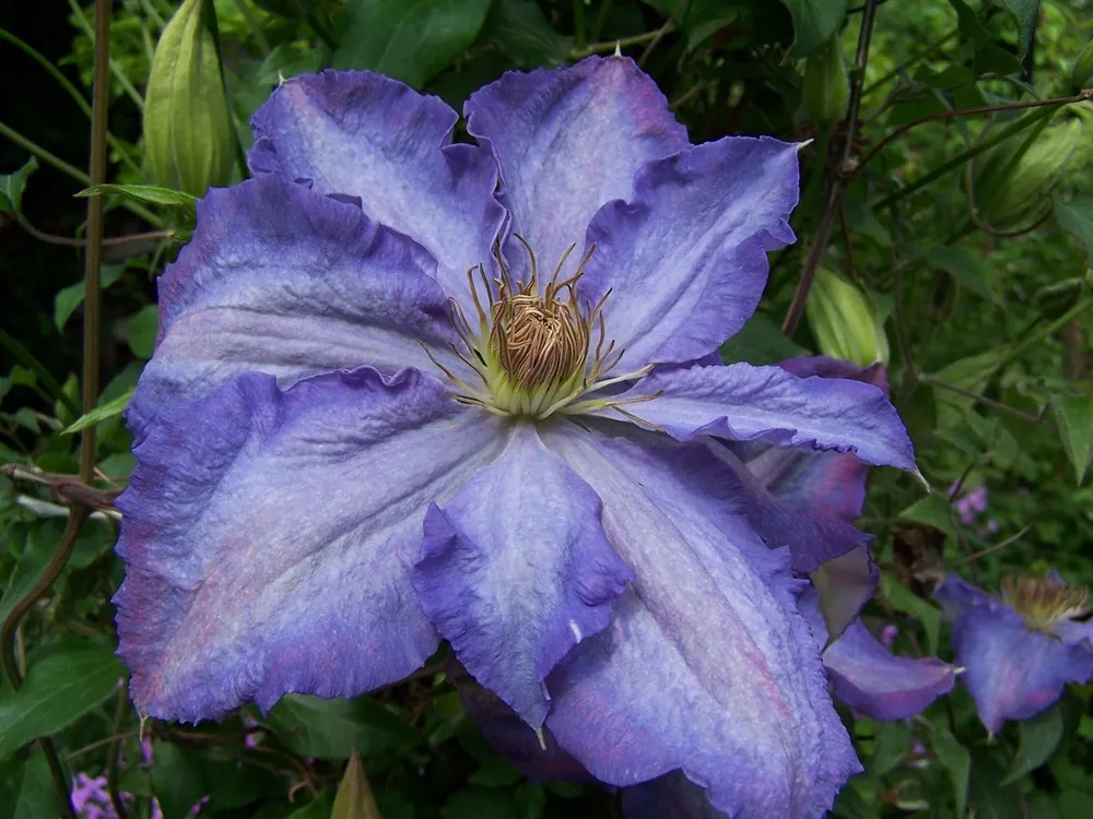 Клематис Джипси Квин, с его изящными ложными цветами и насыщенным, пурпурно-фиолетовым цветом, покорил сердца многих садоводов. Этот сорт, выведенный в 1987 году английским селекционером Дэвидом Хэнсоном, является настоящей жемчужиной среди клематисов группы «Альпина» благодаря своему непревзойденному цветению и неприхотливости. Джипси Квин – это красивоцветущий лиана с полумахровыми цветами диаметром 8-12 см. Цветение начинается в конце весны, продолжается до середины лета и может повторно зацвести осенью. Цветы собраны по несколько штук на длинных цветоносах, придавая кусту пышность и изящность. Листья темно-зеленые, глянцевые, с зубчатым краем.