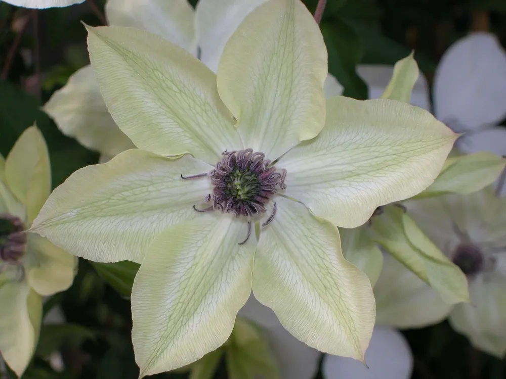 Клематис Писташио Кейк выделяется среди других сортов своей уникальной окраской цветков, напоминающей писташковый торт.
