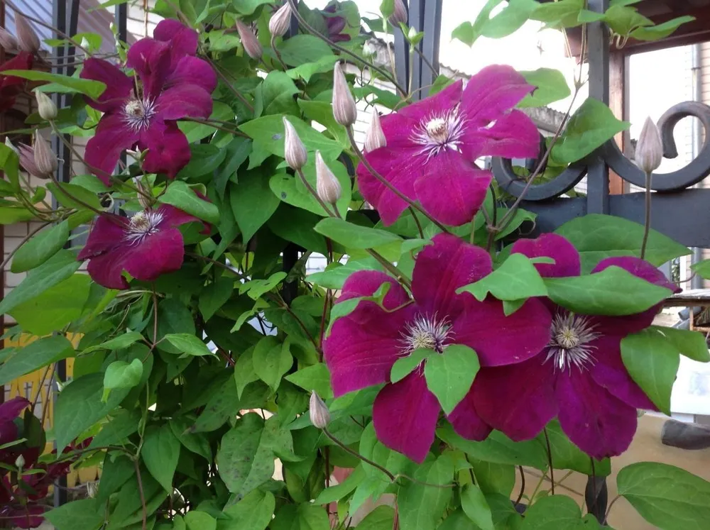 Клематис Руж Кардинал – это вьющееся растение, которое может достигать высоты 3-4 метра. Его мощные побеги быстро оплетают опоры, создавая роскошный зеленый куст с обильным цветением.