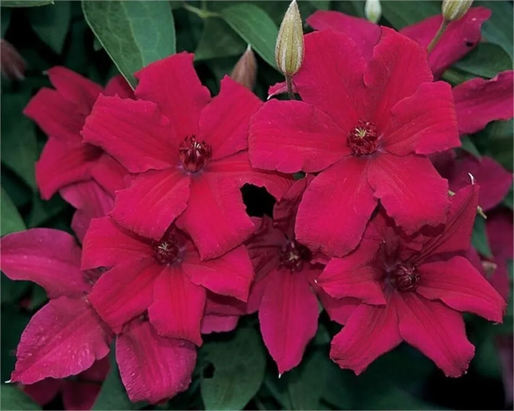 Цветки клематиса Руж Кардинал крупные (до 12 см в диаметре) и махровые, состоят из множества лепестков. Они собраны в соцветия по 3-5 штук. Цветение начинается в июне и продолжается до сентября.