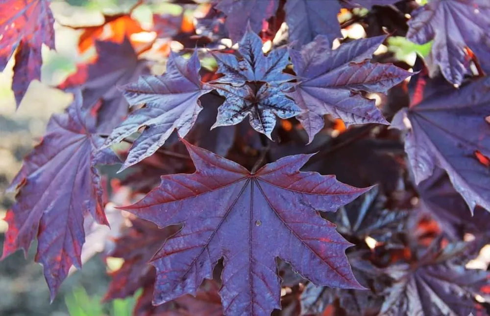 Клен ‘Crimson King’ обладает более широкой кроной и более темной, почти бордовой листвой.