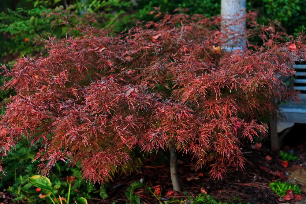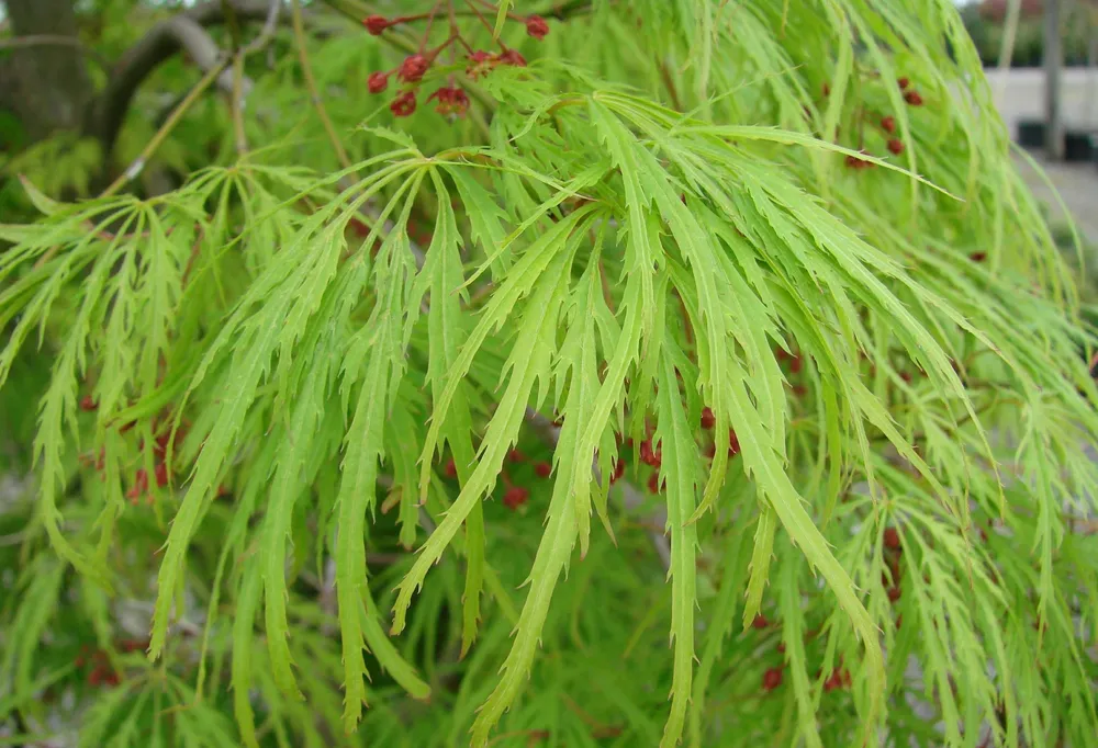 Клен веерный Сейрю – это декоративный сорт клена, выведенный в Японии, который стал популярным в садах по всему миру благодаря своей уникальной форме кроны и привлекательной осенней окраске листьев. Клен веерный Сейрю отличается от своих собратьев не только необычной формой кроны, напоминающей раскрытый зонтик или веер, но и своеобразным сочетанием светло-зеленого цвета листьев с яркими оранжевыми и красными оттенками осенью. Его компактные размеры делают его идеальным выбором для небольших садов и ландшафтных композиций.
